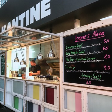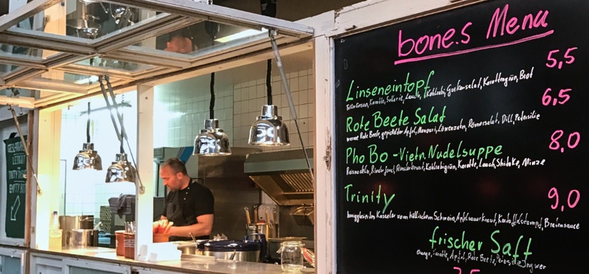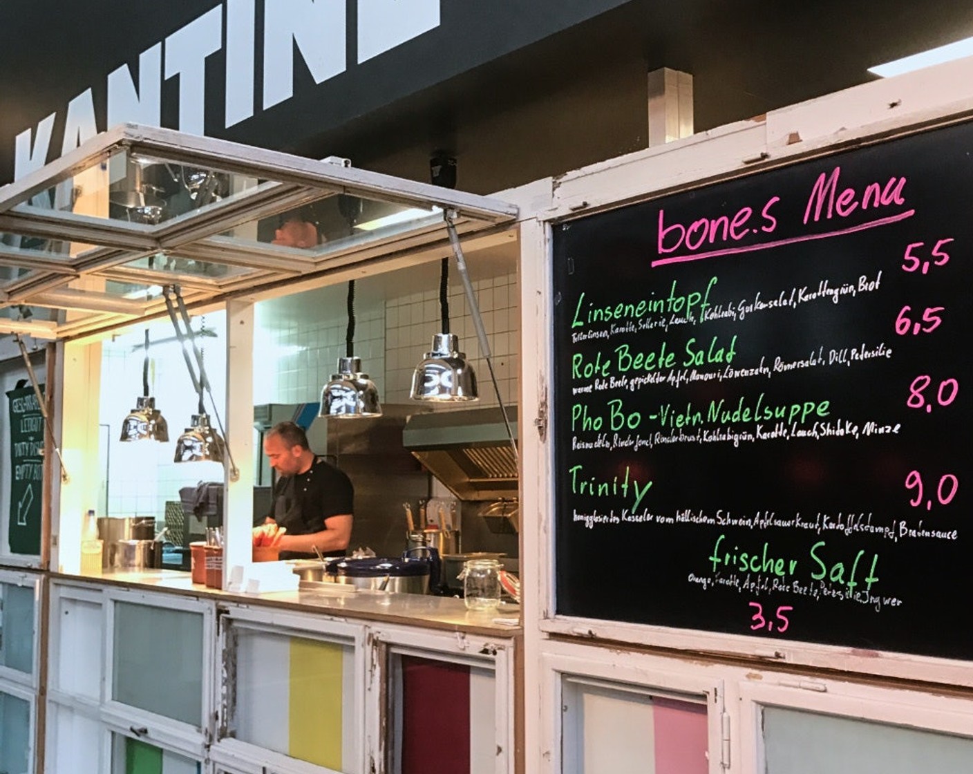 Die Markthalle sollte «Lebensmittel-Punkt» für das den Kiez in Kreuzberg bleiben. «Wir hatten dann die unglaubliche Möglichkeit, dieses denkmalgeschützte Haus kaufen zu können», erzählte mir Bernd Maier, einer der drei Initianten, bei einem Besuch. Über 2000 Quadratmeter Verkaufsfläche stehen zur Verfügung. Daneben aber auch die fast gleiche Anzahl an Lagerfläche, die auch genutzt wird, um innovativen Foodproduzenten eine Heimat zu geben. So wird etwa in den Katakomben der Markthalle aktuell auch Bier produziert, von der Brauerei Heidenpeters. Das sehr frische Bier – eines der besten, das ich schon im Glas hatte – kann man dann sinnigerweise einen Stock weiter oben an seiner Bar zu einem frischen Essen zum Beispiel in der Kantine «bone.» geniessen.