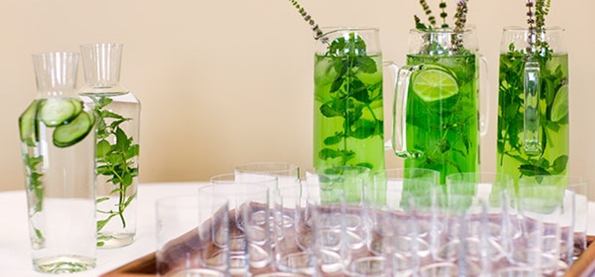 Die ätherischen Öle von Kräutern aromatisieren im Nu das Trinkwasser. Minze, Melisse oder Zitronenmelisse eignen sich besonders gut. Hänge einfach einen Bund der gut gewaschenen Kräuter an den Rand eines Kruges und fülle ihn mit Hahnen- oder Mineralwasser auf.