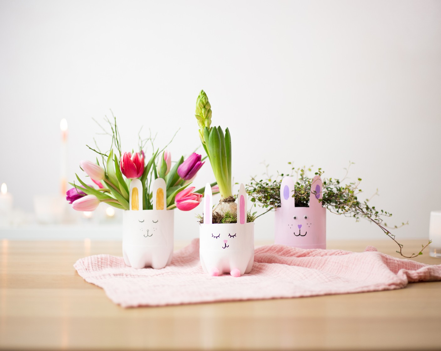 Mit einem Permanent Marker kannst Du die Gesichter der Hasen aufmalen. Als Augen kannst Du Wackelaugen verwenden und für flauschige Hasen-Pfoten Pompons auf die runden Ausstülpungen des PET-Flaschenbodens aufkleben. Neckisch ist auch ein Pompon als Hasenschwänzchen auf der Rückseite