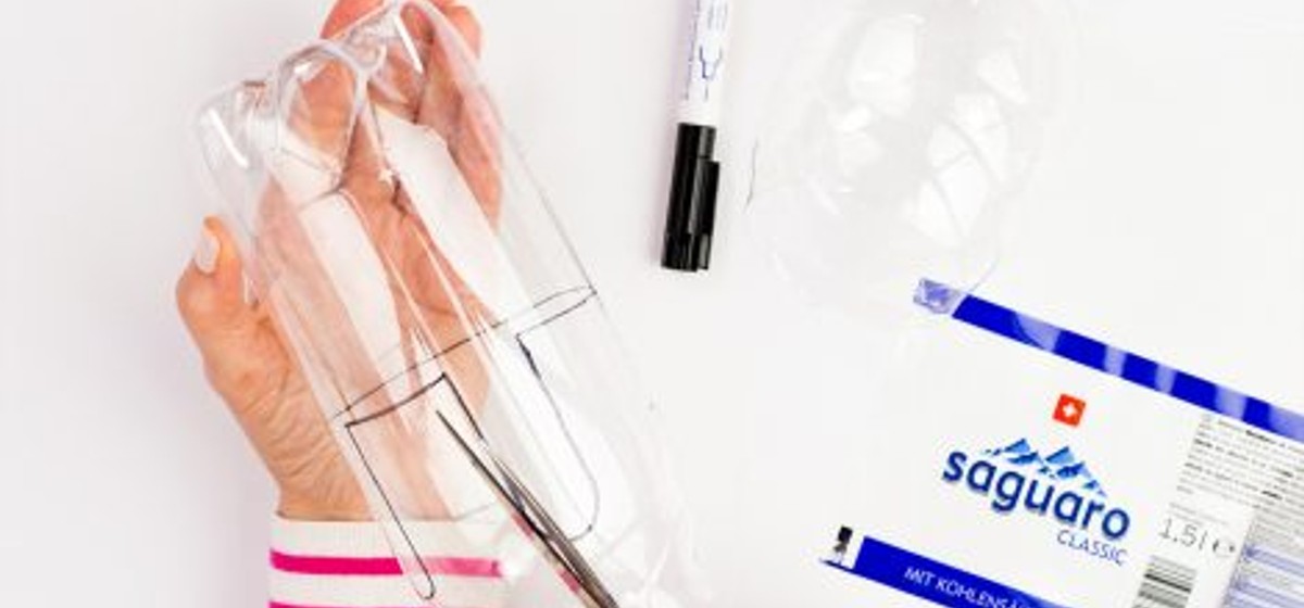 Entferne die Folie auf der PET-Flasche und zeichne Deinen Hasen ein. Anschliessend kannst Du ihn ausschneiden. Achte darauf, dass die Ohren jeweils über den runden Ausstülpungen des PET-Flaschenbodens liegen, diese werden die Hasenfüsse sein.