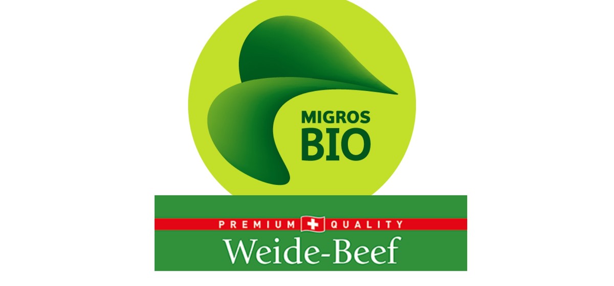 Gütesiegel der Migros für Rindfleisch von Kühen aus biologischer Weidehaltung.