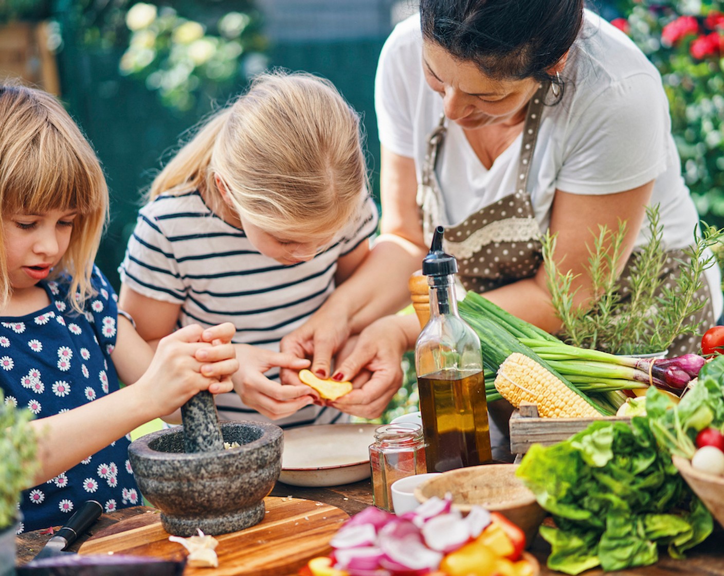 Zunächst einmal lernen sie unverarbeitete Lebensmittel kennen und erfahren, was beispielsweise alles in einen Brotteig oder in eine Gemüsesuppe hineinkommt. Da Kochen etwas sehr Soziales ist, bei dem viele Absprachen nötig sind, fördert es das Sozialverhalten deines Kindes. Beim Schälen und Schnippeln entwickelt es seine motorischen Fähigkeiten weiter. Und am Ende steht natürlich die geteilte Freude beim Essen des Gemeinschaftswerkes.
