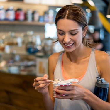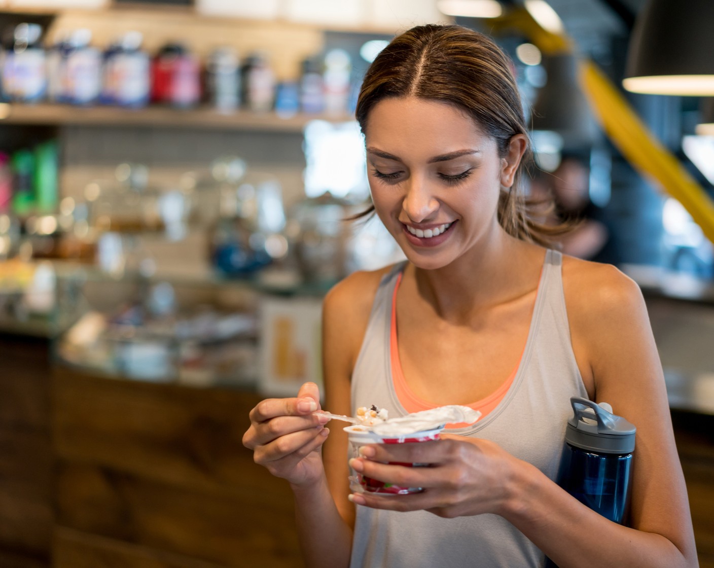 Quark und Joghurt enthalten nicht nur wertvolles Protein, sondern auch wertvolle Mineralstoffe wie Calcium und Magnesium. Calcium ist für die Muskelkontraktionen wichtig; Magnesium entspannt die Muskeln und beugt Muskelkrämpfen vor. Mit einem Esslöffel Haferflocken oder Granola bekommt dein Körper noch ein paar Kohlenhydrate für richtig viel Power. Der Fettgehalt der Milchprodukte sollte möglichst gering sein, um die Verdauung nicht unnötig zu belasten.