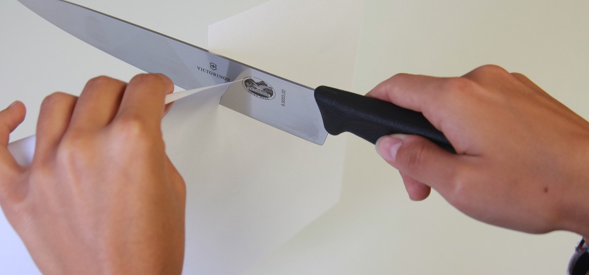 Es gibt verschiedene Möglichkeiten, um zu sehen, ob ein Messer geschärft werden muss. Da wäre einmal der Papiertest: Halte ein Stück Papier in einer Hand und nimm das Messer in die andere. Schneide das Papier durch. Eine scharfe Klinge geht durch das Papier wie ein Messer durch warme Butter. Eine weitere Möglichkeit ist der Tomatentest: Wenn dein Messer Probleme hat, die dünne Haut und das zarte Fleisch einer Tomate zu durchdringen, muss es wahrscheinlich geschärft werden.