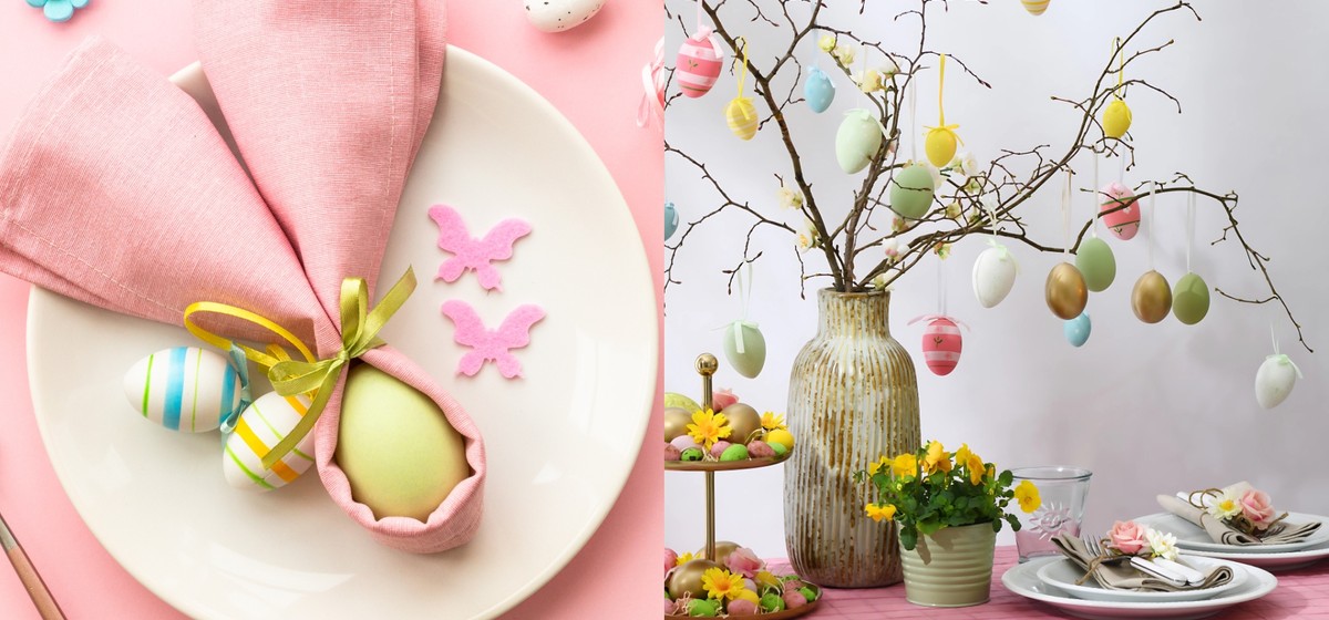 Stimmungsvolle Beleuchtung, z. B. durch Kerzen in sanften Farben oder Lichterketten in Glasbehältern, schafft eine gemütliche Atmosphäre. Auch geflochtene Osterkörbchen mit kleinen Blumengestecken oder rustikale Holzelemente unterstreichen den natürlichen Charme des Frühlings.