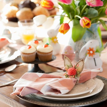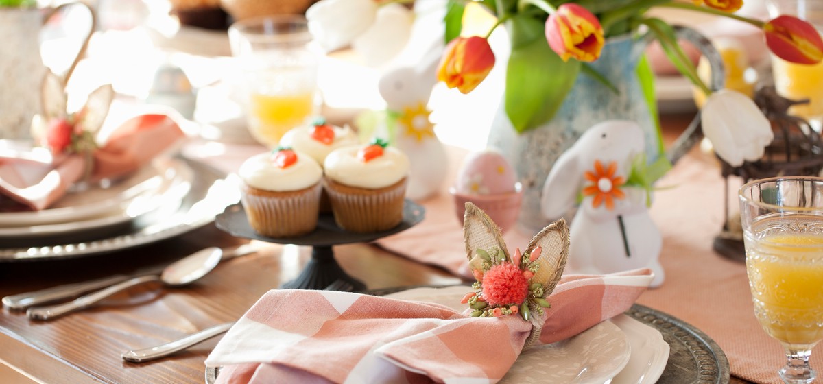 Stimmungsvolle Beleuchtung, z. B. durch Kerzen in sanften Farben oder Lichterketten in Glasbehältern, schafft eine gemütliche Atmosphäre. Auch geflochtene Osterkörbchen mit kleinen Blumengestecken oder rustikale Holzelemente unterstreichen den natürlichen Charme des Frühlings.