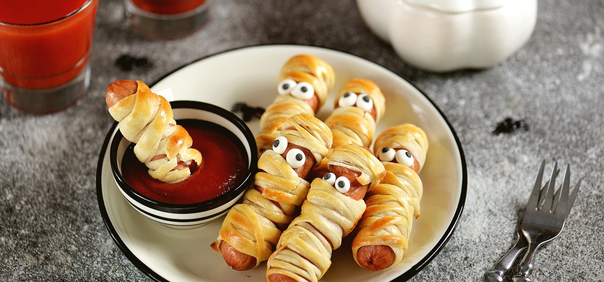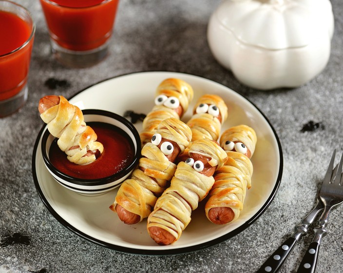 Halloween ist auch die Zeit für kreative Snacks und Desserts! Wie wäre es zum Beispiel mit Würstchen-Mumien oder gruseligen Augen-Bowls, die aus gefüllten Mozzarellakugeln bestehen und wie kleine Monsteraugen aussehen? Sie schmecken nicht nur lecker, sondern sind auch ein Hingucker auf jeder Halloween-Party.