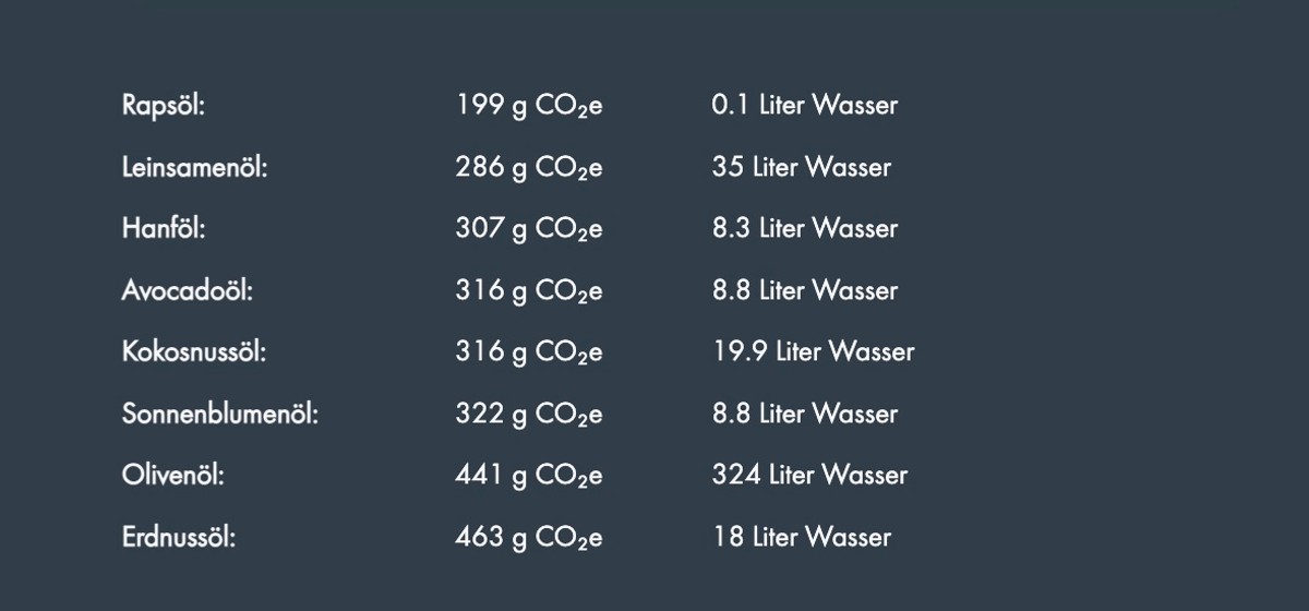 Für kalte Speisen ist das Leinsamenöl ebenfalls eine sehr gute Wahl, zwar liegt der CO2-Fussabdruck im Vergleich im Mittelfeld, auch der Verbrauch von knappem Wasser ist höher als beim Rapsöl. Dafür punktet es mit einem sehr hohen Anteil von Omega-3 Fettsäuren.