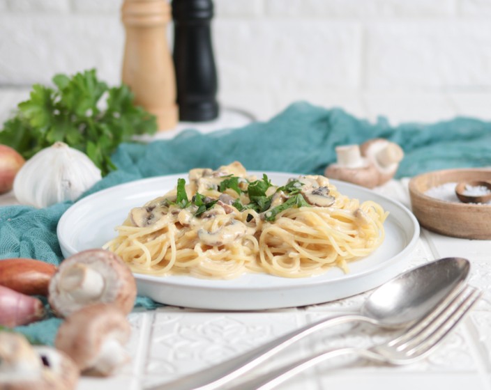 Alle Zutaten, die im klassischen Rezept für Spaghetti Carbonara Anteile tierischer Herkunft enthalten, werden durch alternative hochwertige Zutaten ersetzt, zum Beispiel durch Räuchertofu, Edelhefe und Cashewmus. Das Endergebnis ist hervorragend und kann in jedem Fall mit dem Original mithalten. Wer auf Käse zur Abrundung des Pasta-Gerichtes nicht verzichten möchte, kann statt Parmesan Nussmesan verwenden.