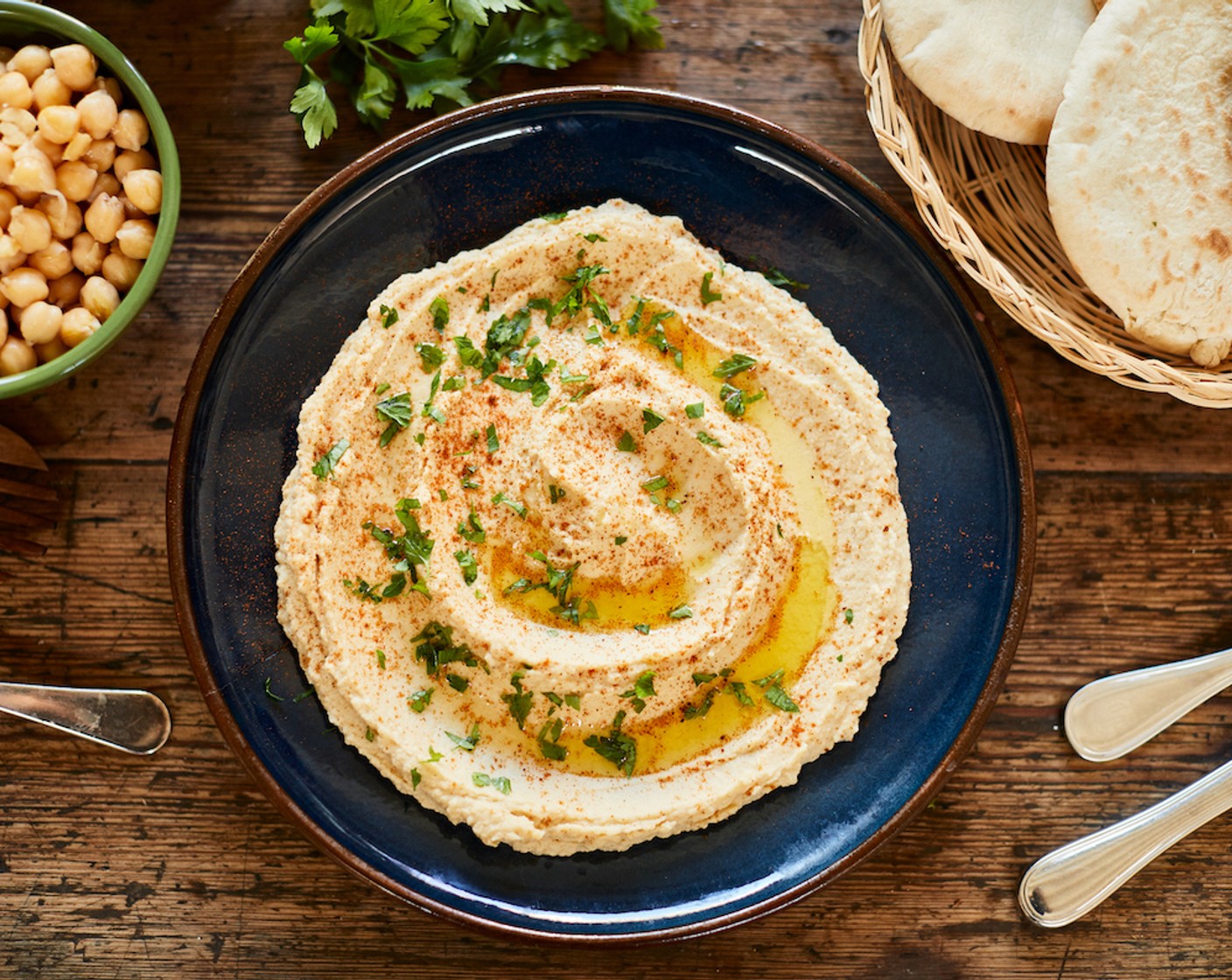Hummus ist ein Gericht, welches hauptsächlich aus Kichererbsen, Tahini, Zitronensaft, Olivenöl und verschiedenen Gewürzen zubereitet wird. Das Wort Hummus kommt aus dem Arabischen und bedeutet Kichererbsen. Kichererbsen sind der Hauptbestandteil eines klassischen Hummus. Wenn du abenteuerlustig bist und auch gerne mal etwas Neues ausprobieren möchtest, gibt es auch die Möglichkeit den Hummus aus weissen Bohnen zuzubereiten. Servieren kannst du Hummus zum Beispiel mit Fladenbrot wie zum Beispiel Naan, Chips oder Gemüse wie Gurken oder Karotten.