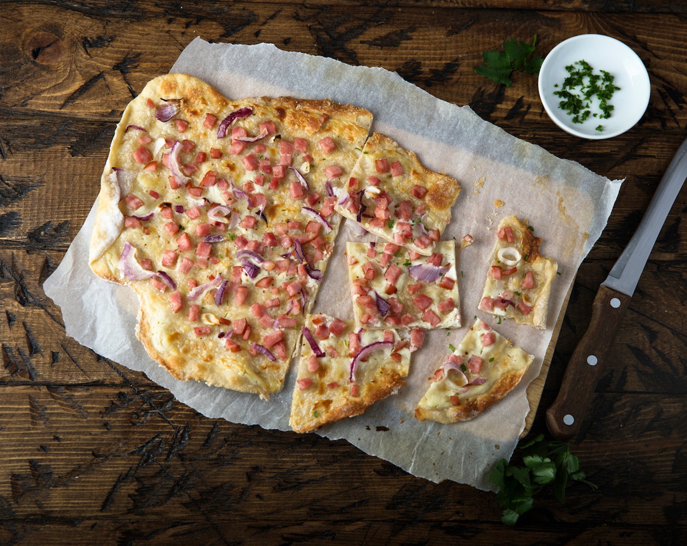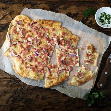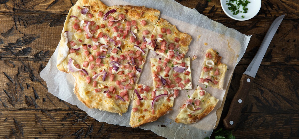 Das Flammkuchen-Rezept von V-ZUG ist eine klassische Variante mit Crème fraîche, Speck und Zwiebeln als Belag. Der Teig wird in diesem Rezept mit Hefe zubereitet und nach dem Ausrollen mit dem Belag belegt. Nach ca. 12 Minuten im Ofen bei 230 Grad Heissluft ist der Flammkuchen fertig zum Geniessen.