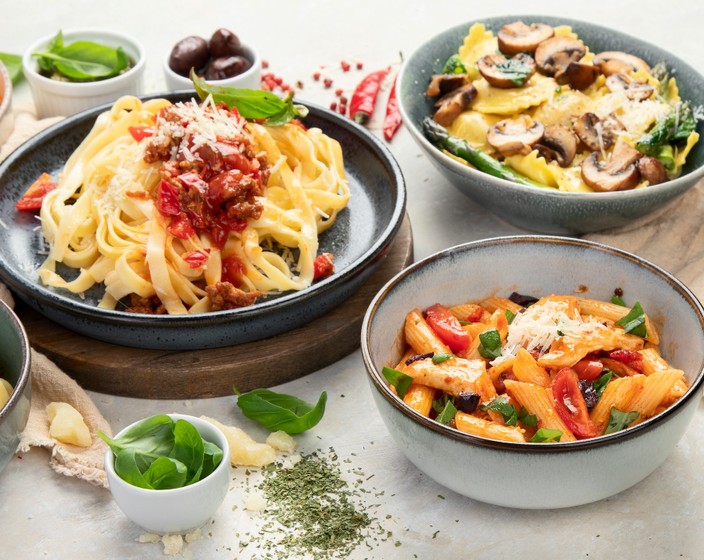 Den Anfang machen wir mit Teigwaren. Wer liebt sie nicht, die beliebten Teigwaren, auch Pasta oder Nudeln genannt? Es gibt sie in verschiedenen Formen, zum Beispiel als Suppennudeln, Spaghetti, Bandnudeln, Hörnli und in unzähligen Kombinationen: mit Sauce, überbacken, als Suppeneinlage, Auflauf oder als leckerer Nudelsalat. Gerade weil Teigwaren so praktisch und vielseitig sind, lohnt es sich, gleich eine grössere Menge zu kochen und zu unterschiedlichen Gerichten zu verarbeiten. Also, man nehme einen grossen Topf...