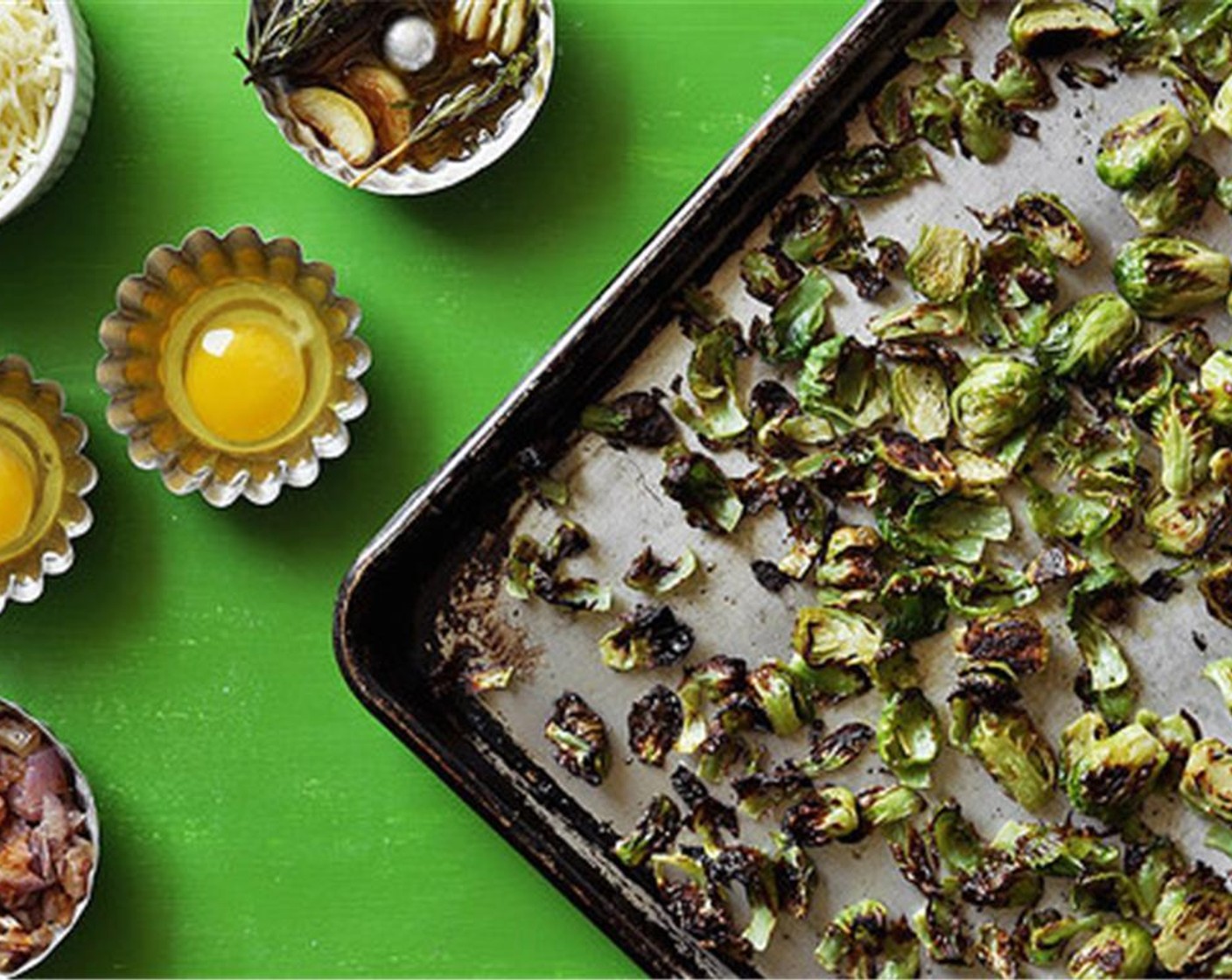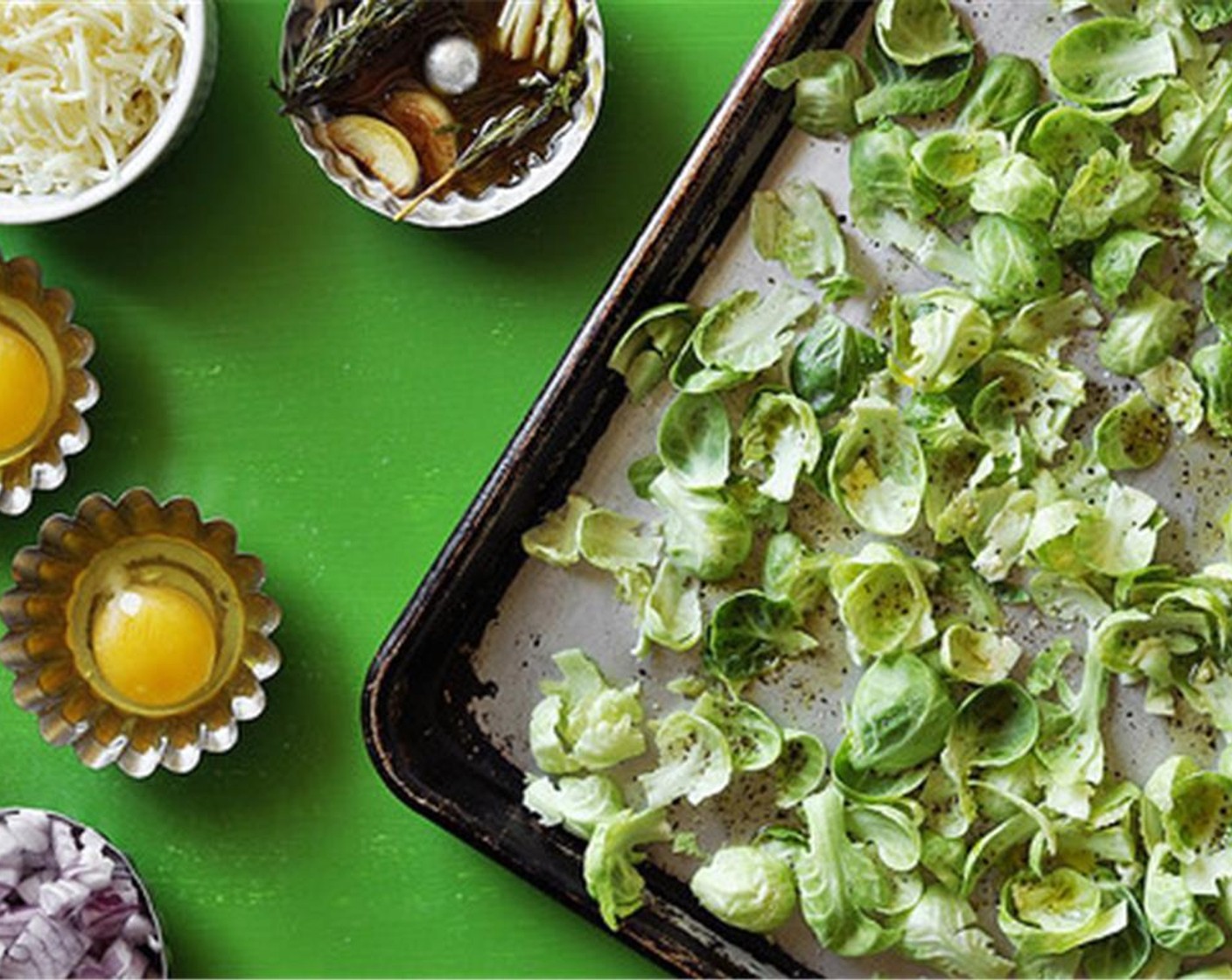Rosenkohlblätter (455 g) abtrennen. Die Blätter auf ein Backblech legen. Mit Olivenöl (1 EL) beträufeln und mit Salz (1 TL) und Pfeffer (1 TL) würzen.