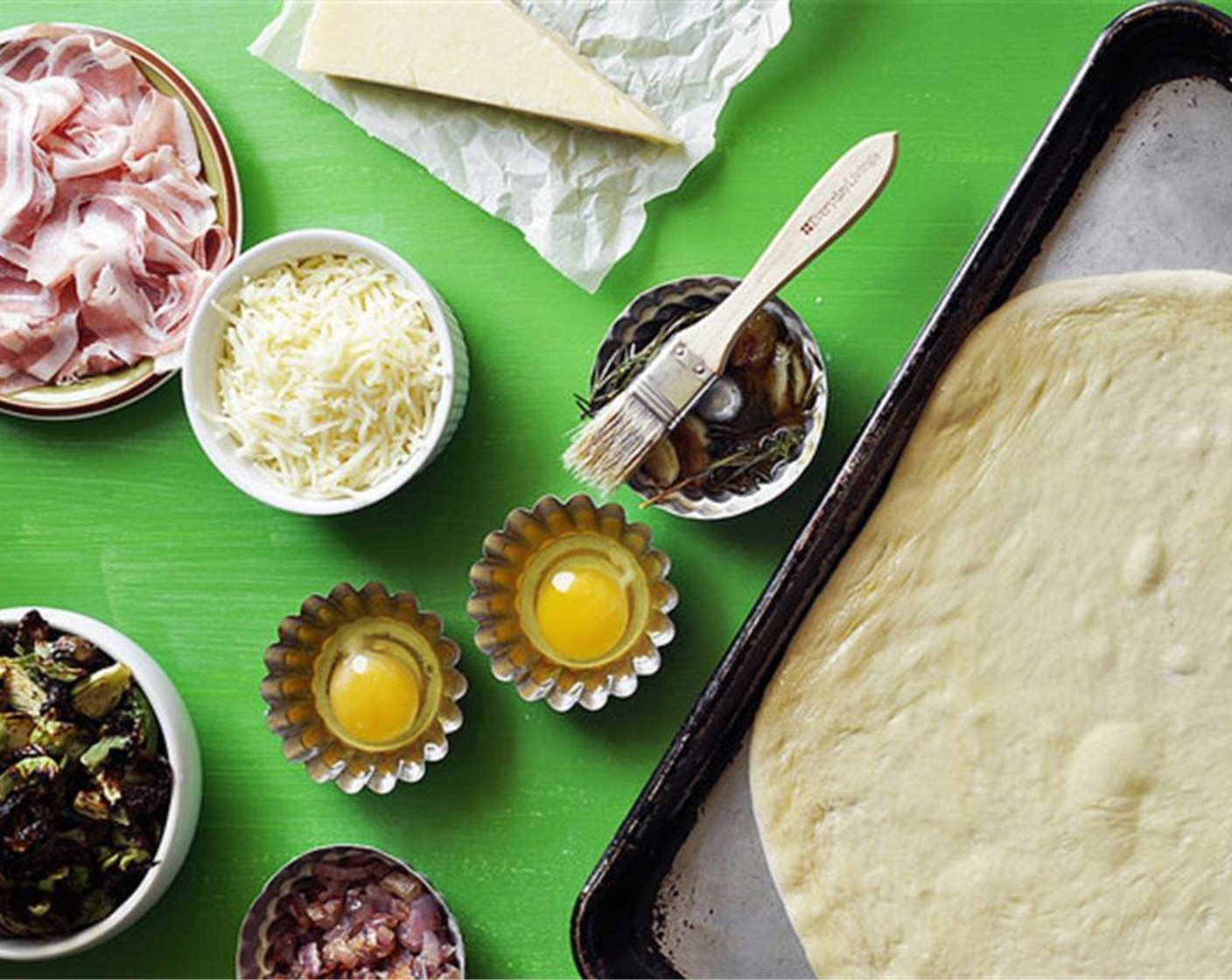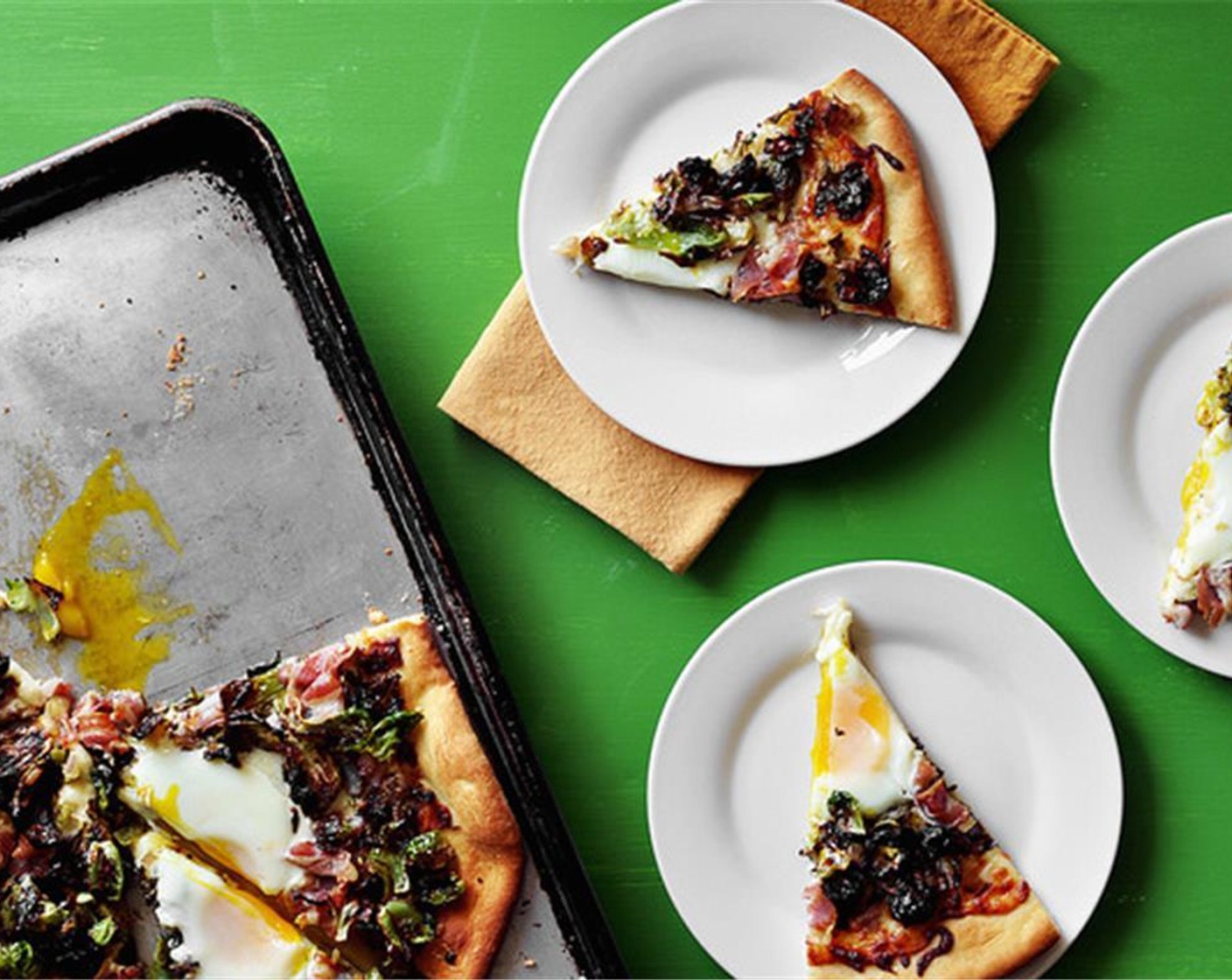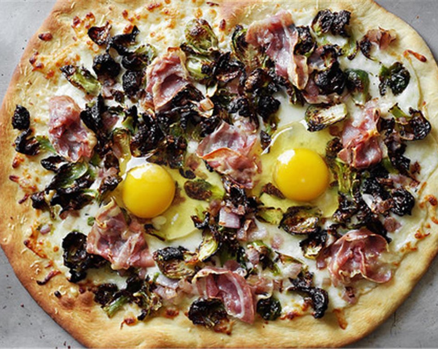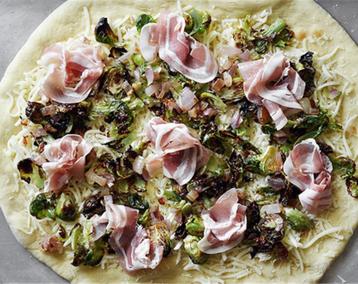 Pizza mit knusprigen Rosenkohlblättern und sautierten roten Zwiebeln belegen. Pancetta darüber verteilen und nochmals 5 Minuten backen, damit der Käse schmilzt und der Teig weiter bräunt.