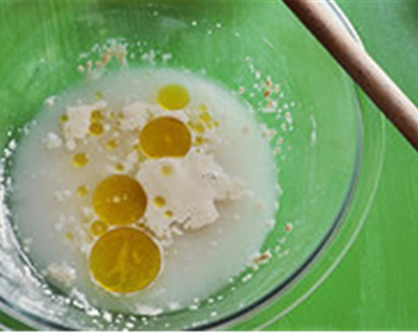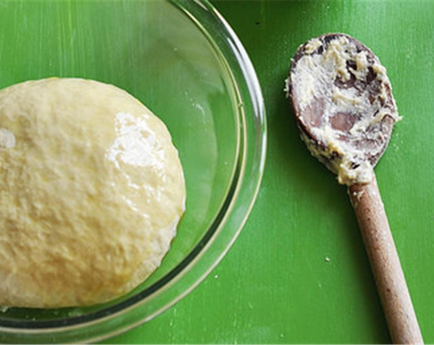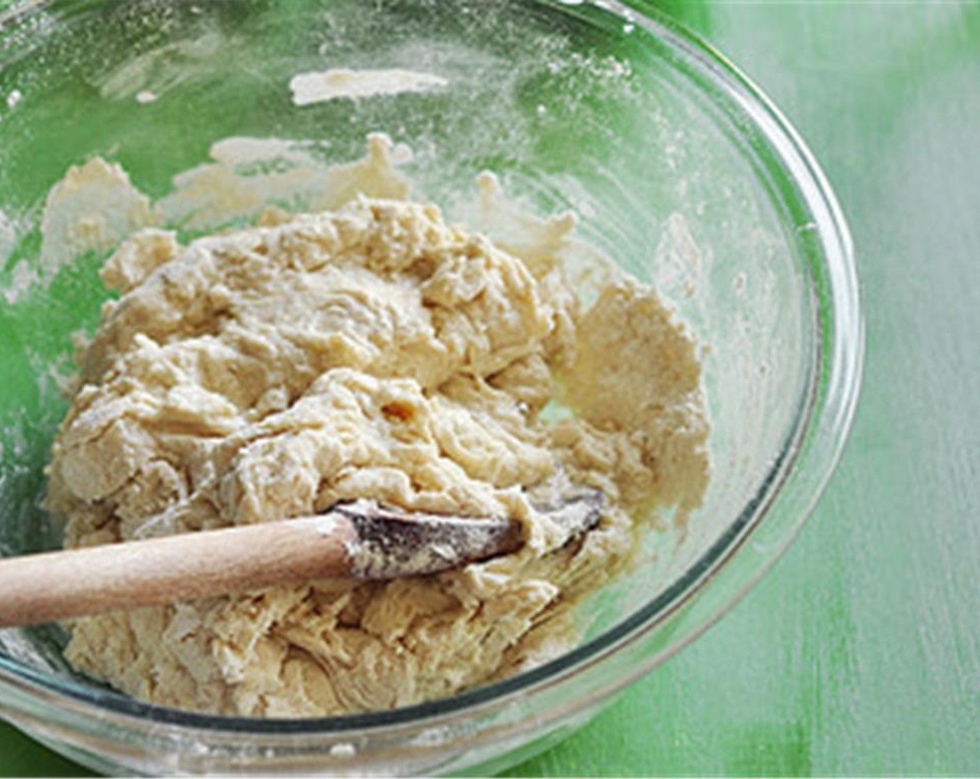 Mit einem Holzlöffel verrühren, bis ein flockiger Teig entsteht. Wenn der Teig zu trocken ist, nach und nach etwas mehr Wasser hinzufügen.