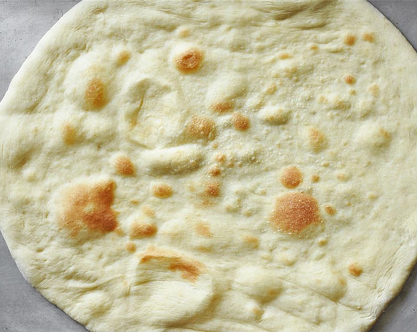 Den Teig in zwei Hälften schneiden und jede Hälfte auf einer leicht bemehlten Arbeitsfläche ausrollen. Zu einem grossen, dünnen Kreis ausrollen. Ausgerollte Teig auf zwei Backbleche legen und grosszügig mit dem Knoblauch-Öl (wenig) oder Olivenöl (1 EL) bestreichen.