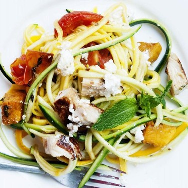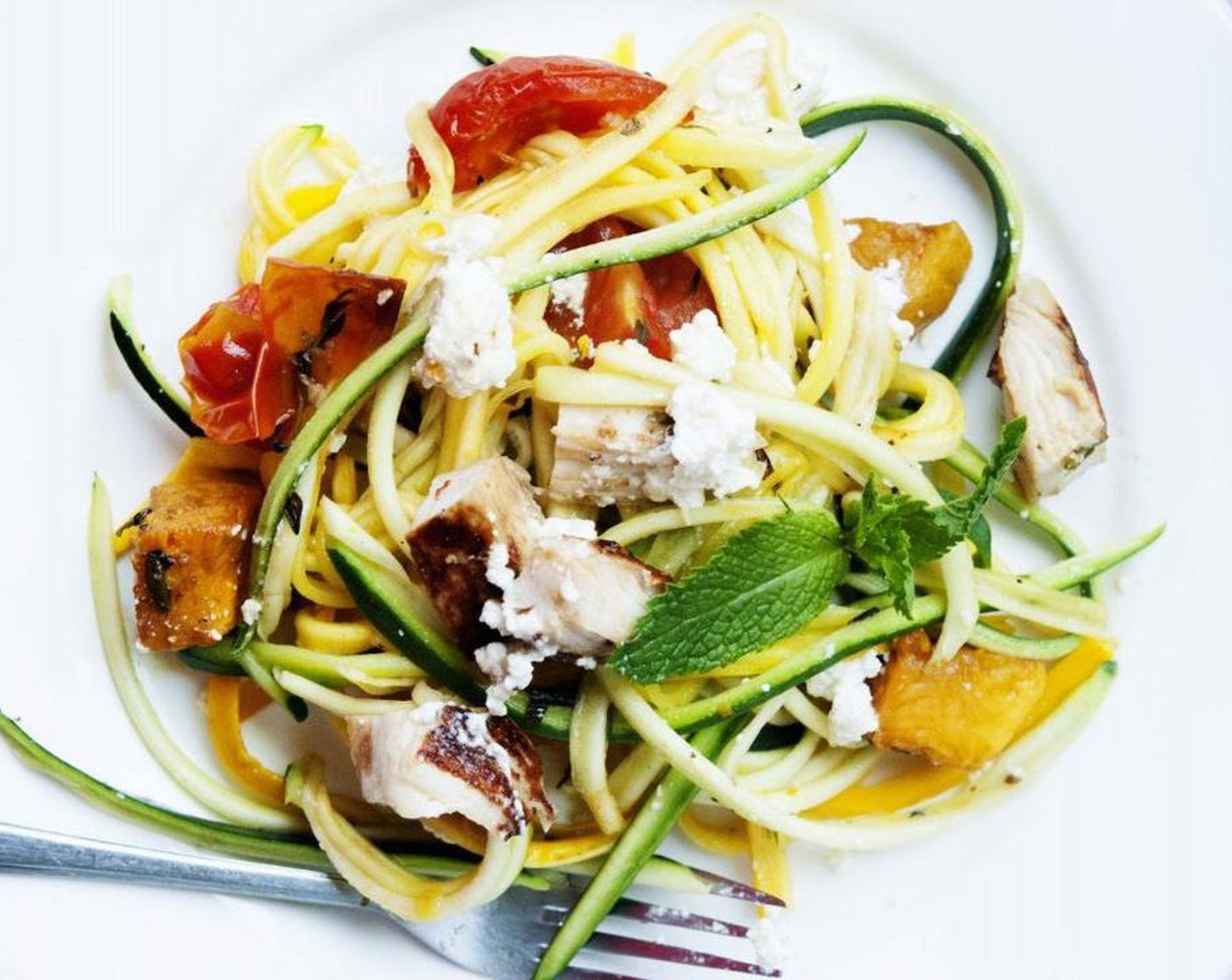 Es ist Nudelzeit! Der Sommer schreit geradezu nach frischen, leichten und farbenfrohen Gerichten wie diese grünen und gelben Zucchininudeln mit gebratenen Tomaten, gegrillter Hähnchenbrust, geröstetem Kürbis und zerbröseltem Feta.