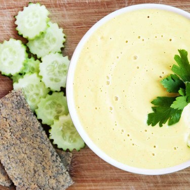 Mit dem cremigen Geschmack des Joghurts und dem würzigen Curry-Aroma ist dieser ausgewogene Kichererbsen-Dip der Hit auf der nächsten Dinnerparty!