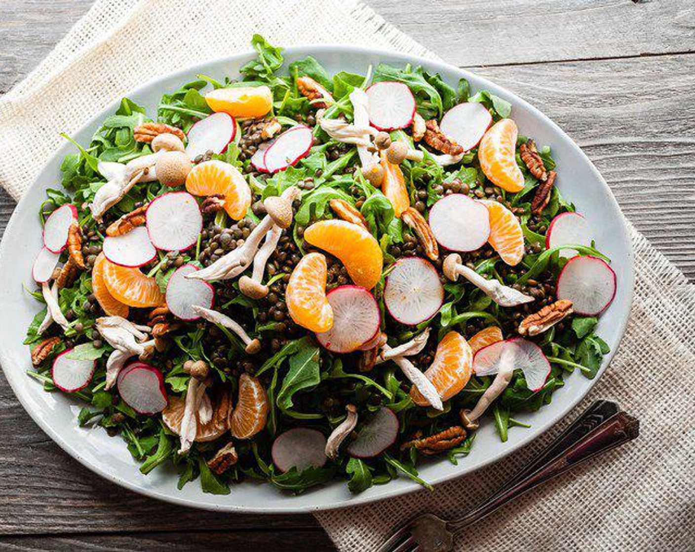 Frisch, schmackhaft und sättigend. Dieser Linsensalat ist vollgepackt mit pfeffrigem Rucola, Champignons, Radieschen, Clementinenscheiben und leckeren Linsen!