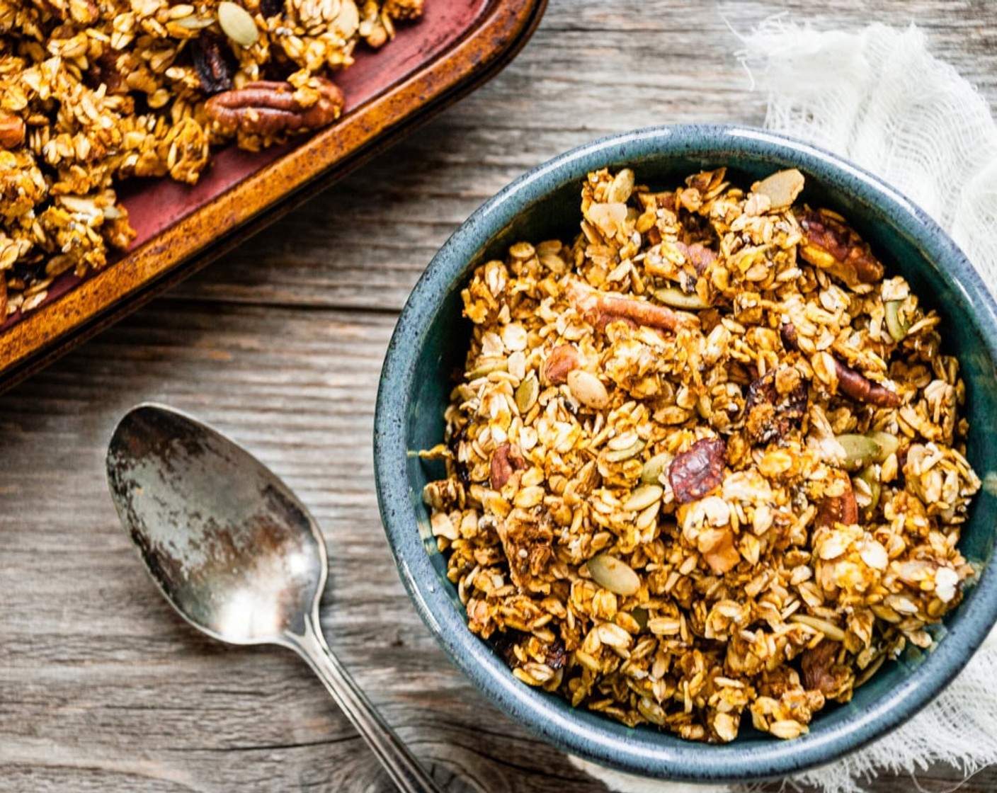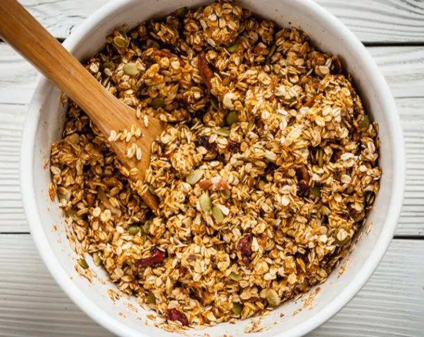 Knusprig, leicht gesüßt und köstlich! Dieses Kürbis-Nuss-Granola ist gefüllt mit perfekt gerösteten Haferflocken, 4 verschiedenen Nüssen/Samen und einem Hauch von Ahornsirup.