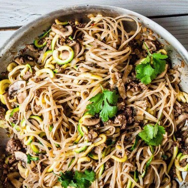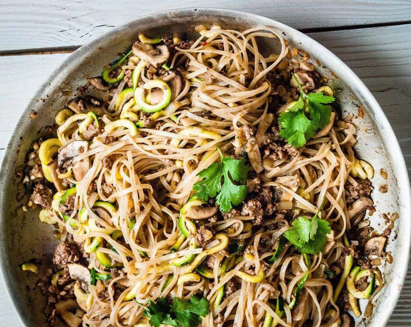 Dieses nicht-traditionelle Pad Thai ist gefüllt mit Pilzen und Zoodles, Rindfleisch aus Weidehaltung und einer leckeren, würzigen Sauce!