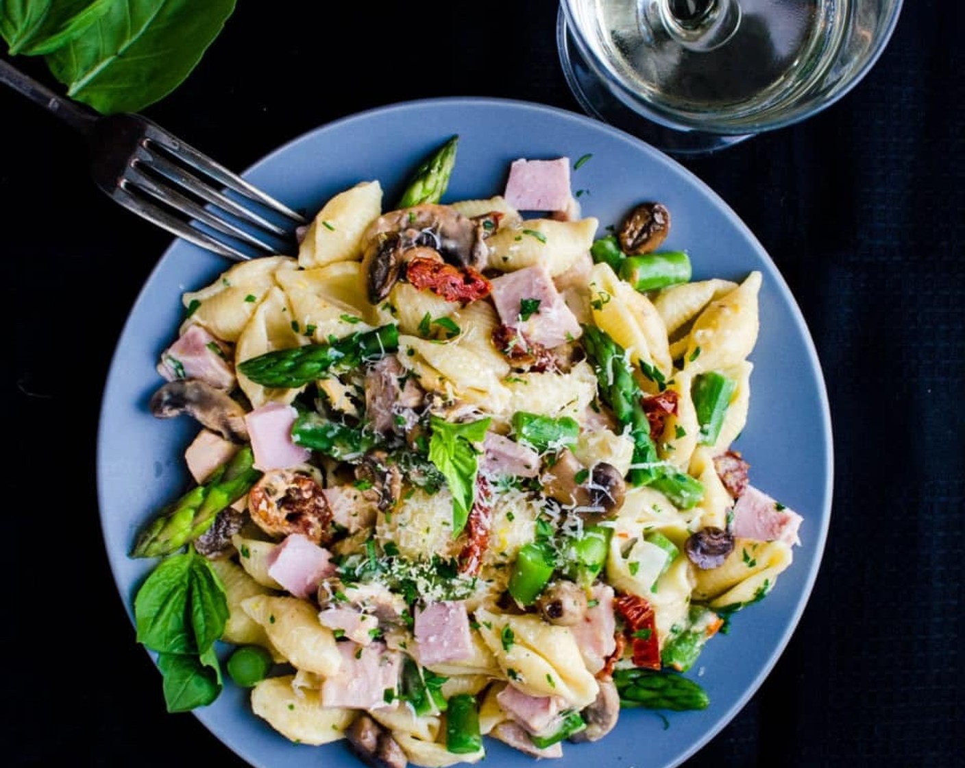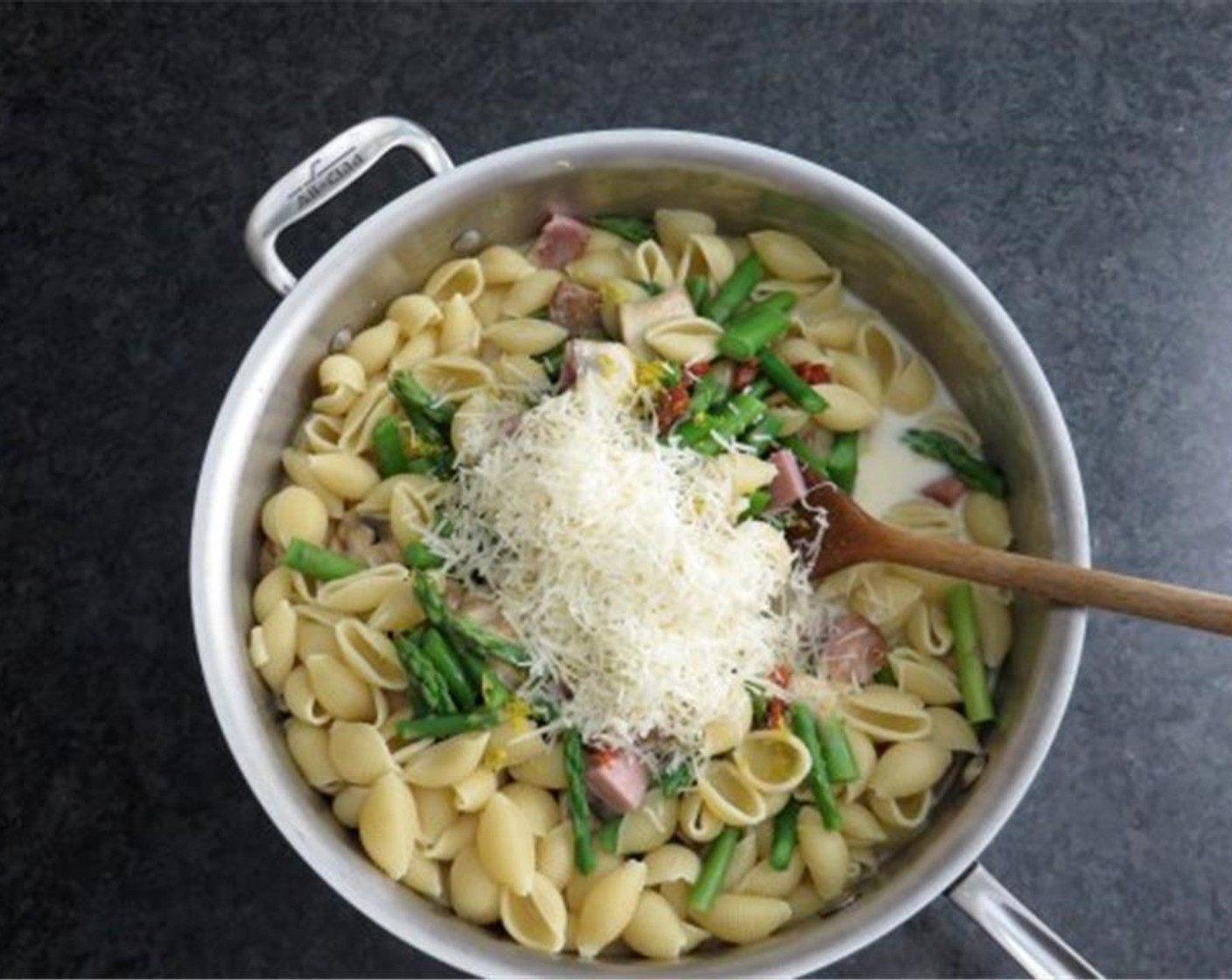 Ein Hauch von Zitrone in Verbindung mit Nudeln, Schinken und Gemüse macht Muscheln mit Schinken, Spargel und Zitronencreme zu einem einladenden Frühlingsgericht.