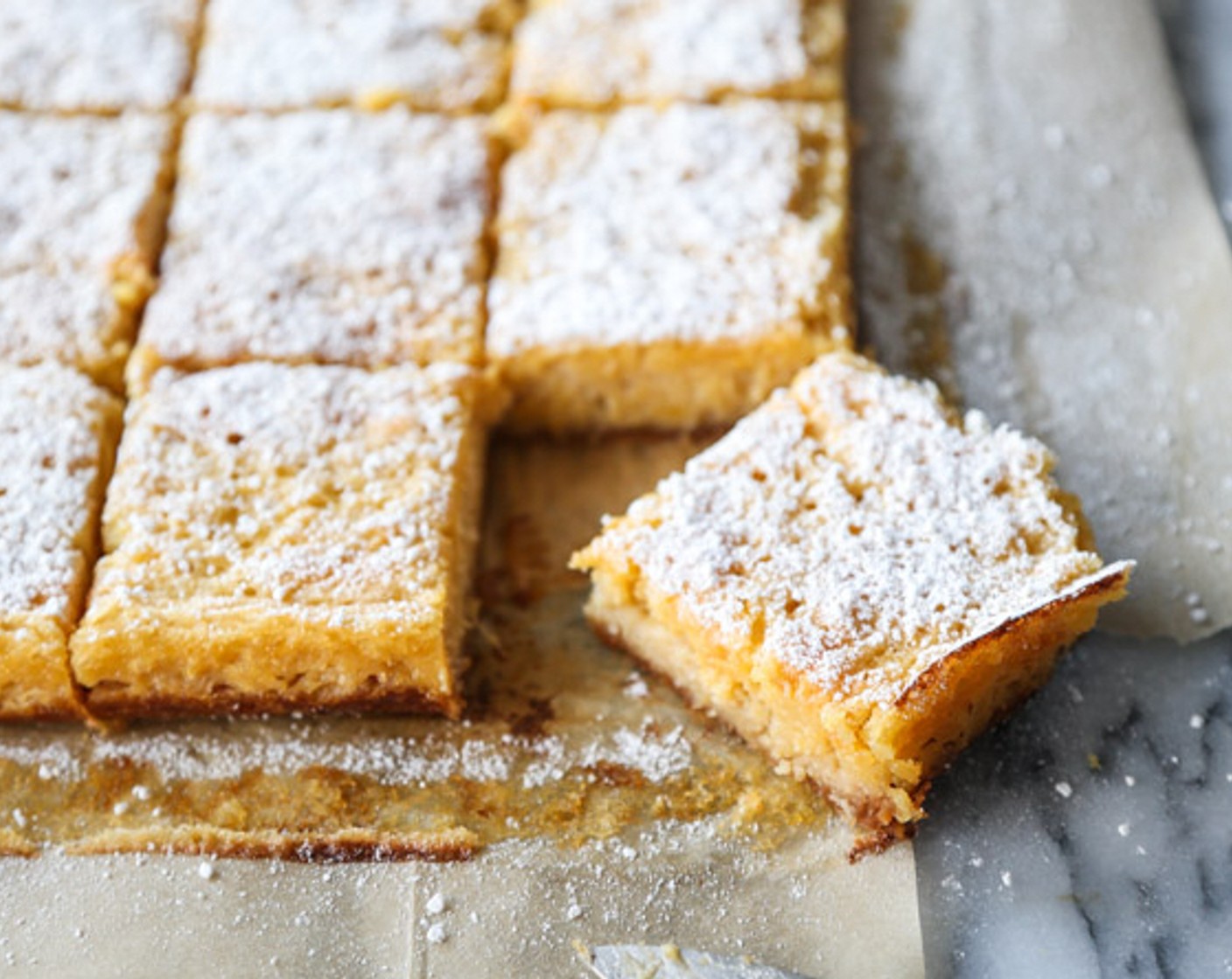 Diese einfache Zitronen-Blechkuchen stammt aus dem Sweet Laurel Cookbook von Laurel Gallucci und Claire Thomas. Ein kleiner Tipp, Man verwendet "Kokosraspel-Puderzucker" anstelle von Puderzucker.