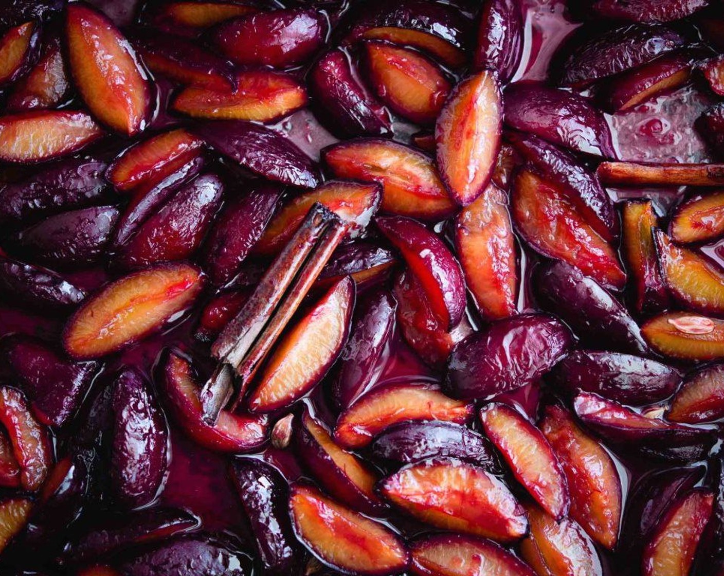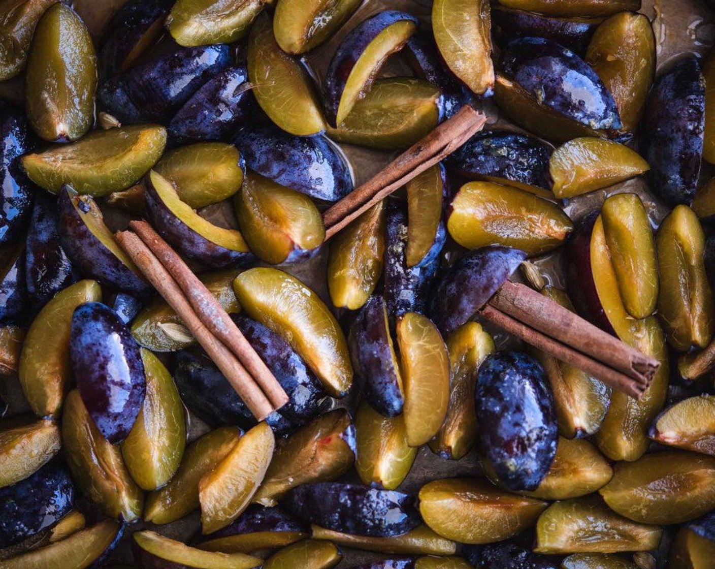 Die Zwetschgen 20 bis 25 Minuten bei 175 °C im Ofen backen, dabei einmal wenden, bis sie gerade weich sind. Dann die Zwetschgen in ihrem Sirup abkühlen lassen, anschliessend die Zimtstangen und den Kardamom entfernen. Zwetschgen bis zum Servieren beiseitestellen.