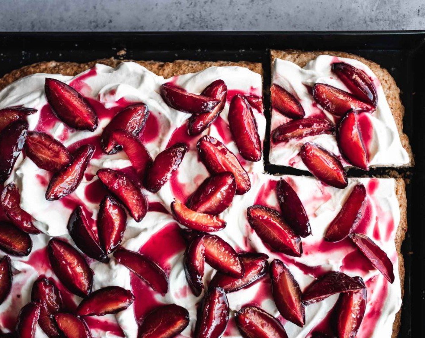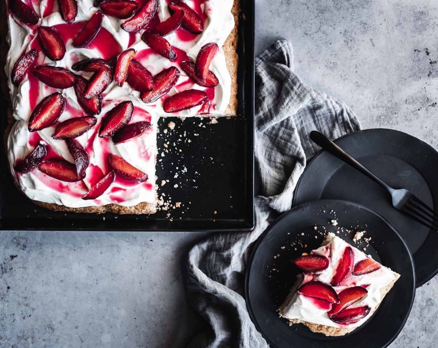 Die gebackenen Zwetschgen vorsichtig auf dem Schlagrahm verteilen und zum Schluss vom Zwetschgensaft darüber träufeln.