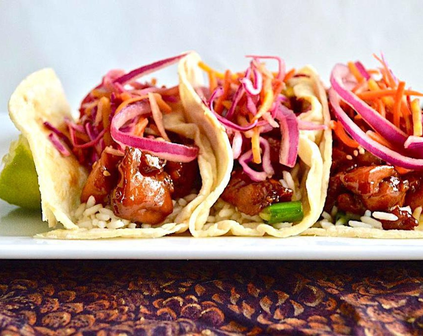 Dies sind so unglaubliche und schmackhafte Teriyaki-Hähnchen-Tacos, die mit duftendem Frühlingszwiebelreis und einem herrlichen asiatischen Krautsalat serviert werden!
