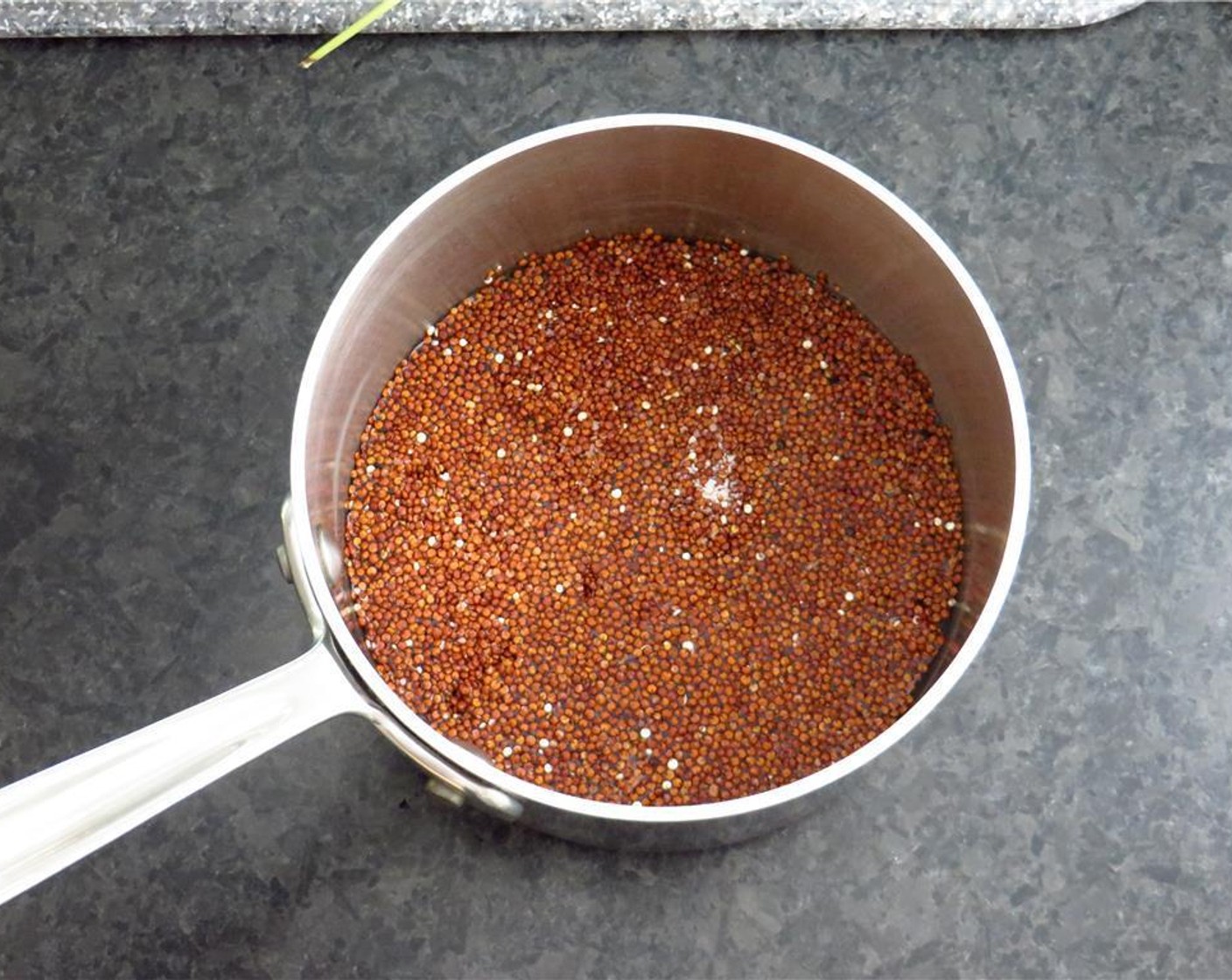 Schritt 2 Quinoa (85 g) und Wasser (240 ml) in einen kleinen Topf geben, zum Kochen bringen und die Hitze auf ein Köcheln reduzieren. Abdecken und 15 Minuten simmern lassen. Dann den Topf vom Herd nehmen und den Deckel abnehmen, damit die Quinoa abkühlen kann.