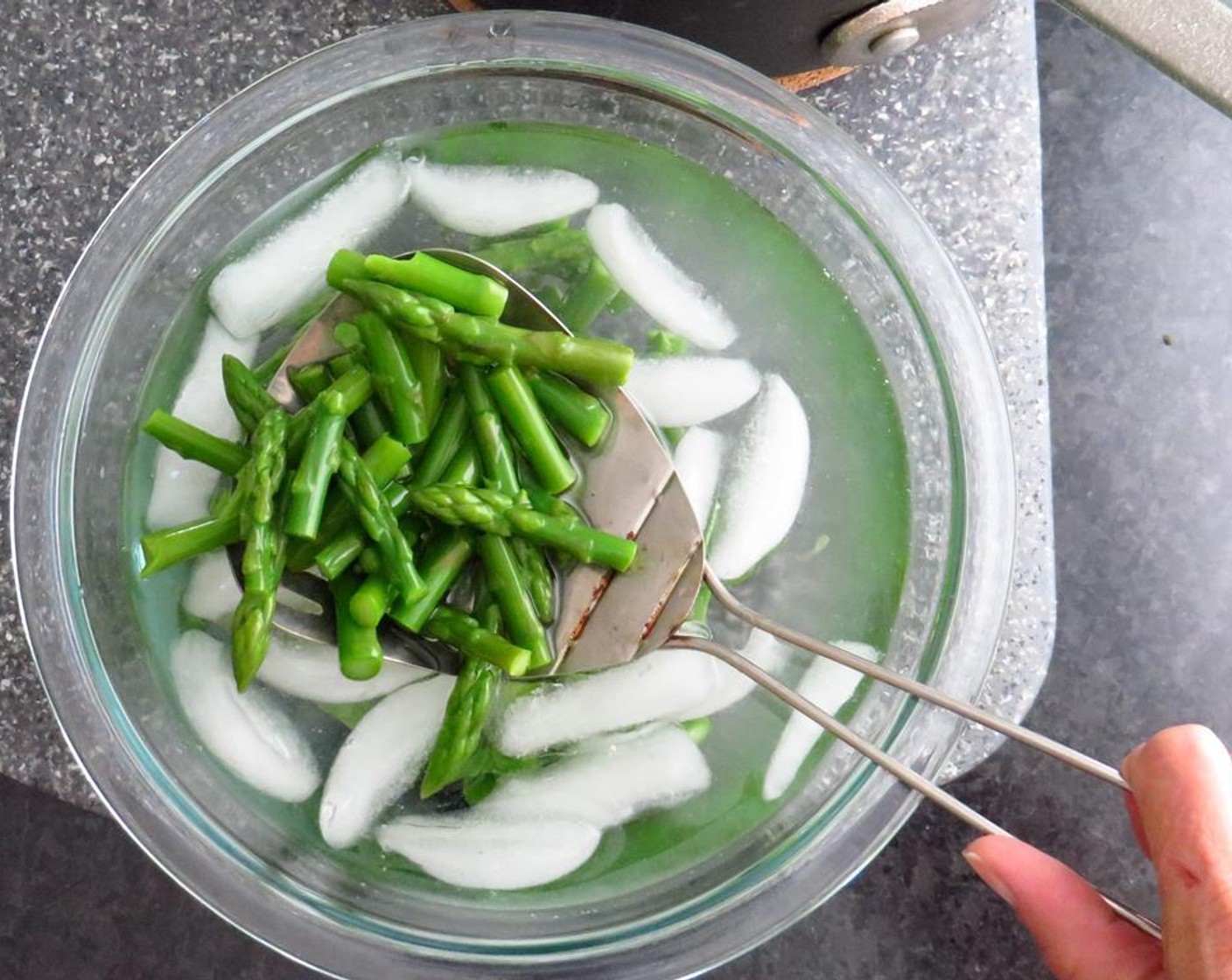 Mit einem Schaumlöffel den Spargel herausheben und in das Eisbad legen, um den Garprozess zu stoppen und die Farbe zu fixieren. Den Spargel herausnehmen und mit einem Papiertuch trocken tupfen.