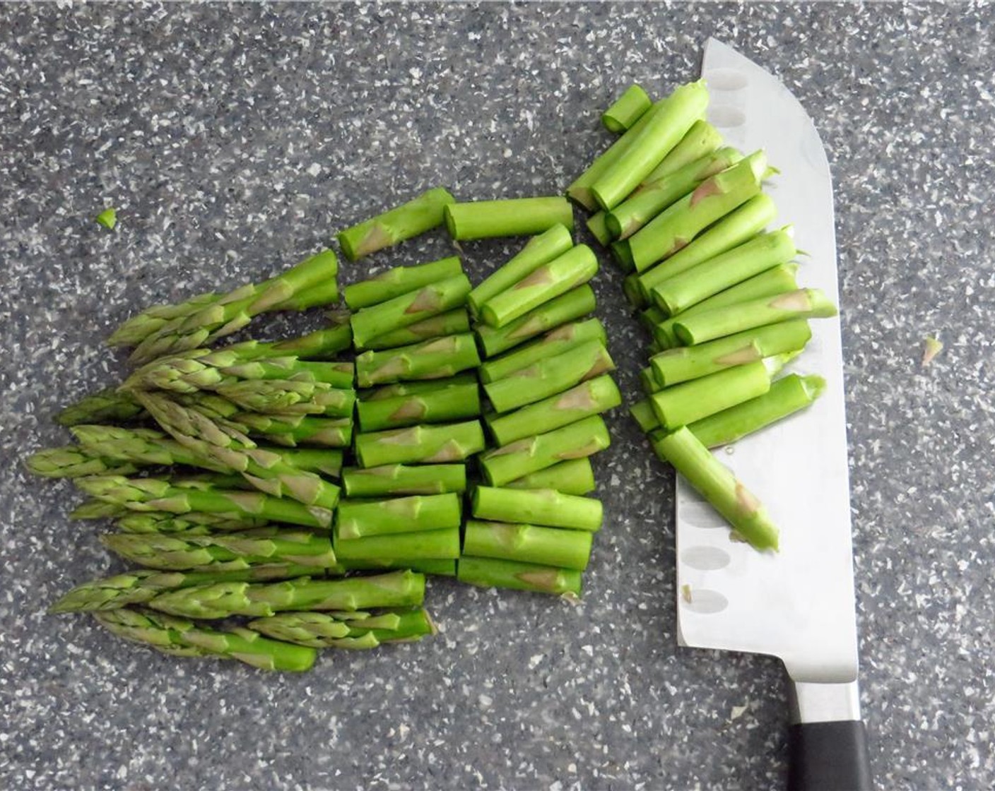 Schritt 1 Die Enden des Spargels (225 g) abschneiden und den Spargel in 1 cm grosse Stücke schneiden. Beiseite stellen.