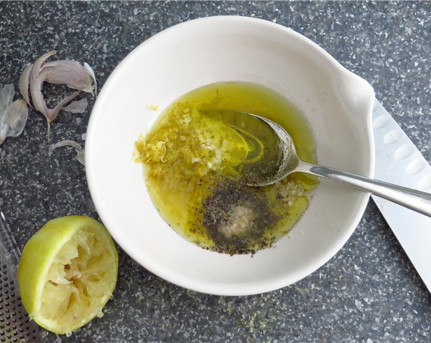 Schritt 5 Für das Dressing die Schale der Zitrone (1) abreiben und die Zitrone halbieren. Die Schale und den Saft der halben Zitrone in einer kleinen Schüssel vermischen. Weissweinessig (1 EL), Olivenöl (4 Esslöffel), Estragon und Minze hinzufügen. Mit dem Schneebesen verrühren. Mit Salz (wenig) und Pfeffer (wenig) würzen.
