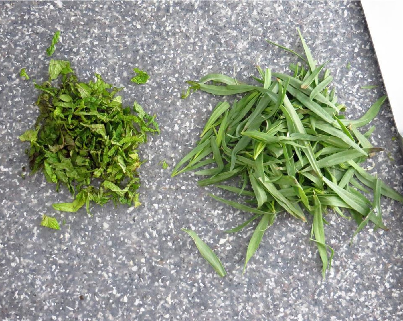 Fetakäse (150 g) zerbröseln. Estragon (4 Esslöffel) und Minze (1 EL) fein hacken. Bundzwiebeln (2) in dünne Scheiben schneiden. Fleischtomate (1) würfeln.