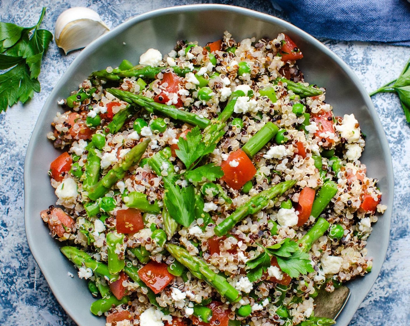Der Quinoa-Spargel-Feta-Salat ist eine gesunde Sommerbeilage, die sich bei einem sommerlichen Grillfest besser hält als jeder matschige Nudelsalat mit Mayonnaise. Mit frischem Spargel, grünen Erbsen, reifen Tomaten und salzigem Feta ist dieser Quinoa-Spargelsalat frisch und leicht.