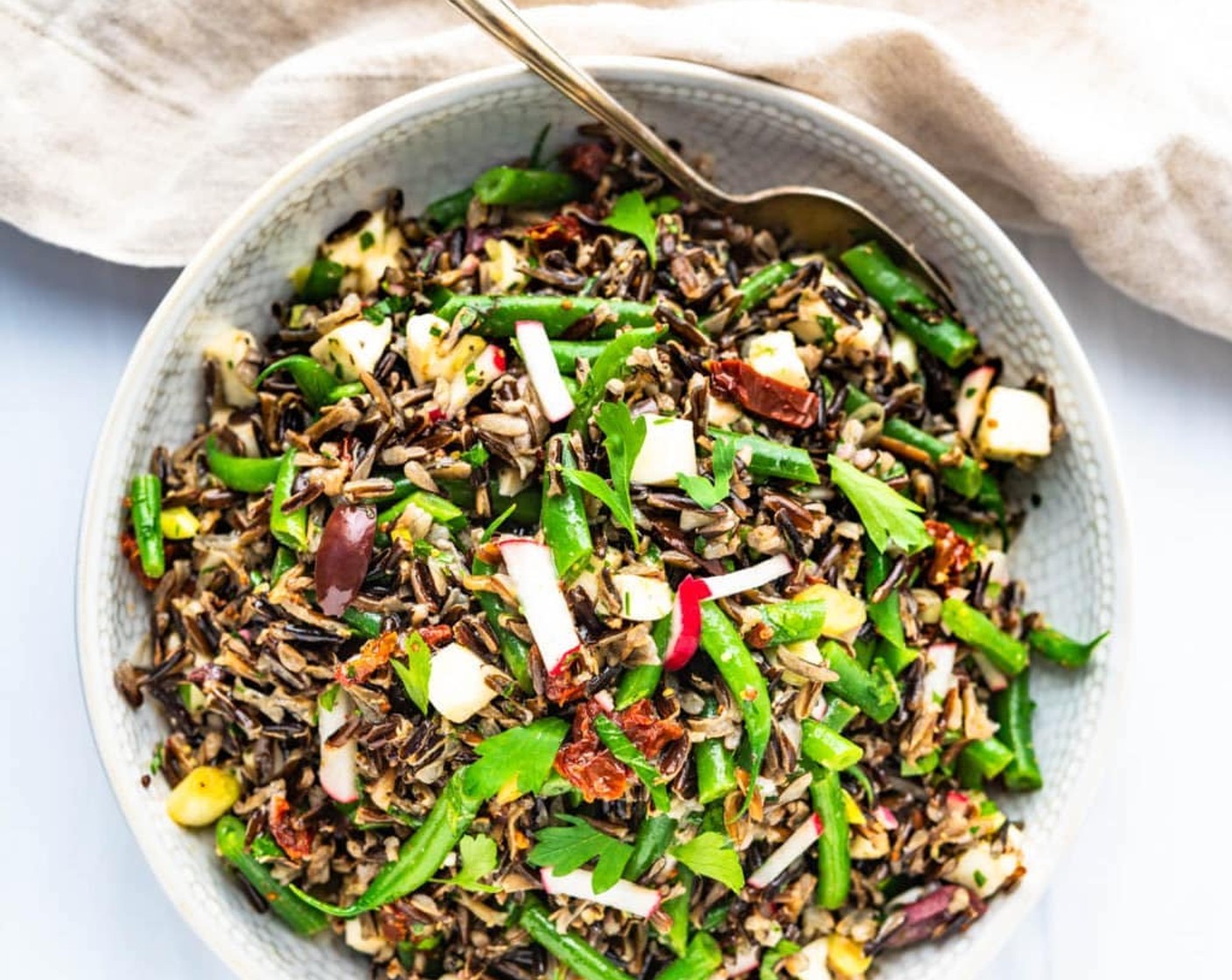 Dieser einfache Wildreis-Salat mit grünen Bohnen ist zum Verlieben. Er ist eine herrlich Beilage, die vor frischen, konzentrierten Aromen wie ölhaltigen getrockneten Tomaten, salzigen Kalamata-Oliven, lebhaften grünen Bohnen und weichen, frischen Mozzarella-Stückchen nur so strotzt. Der erdige Wildreis ist nussiger und strukturierter als die langkörnige Sorte und hält den mediterranen Aromen in diesem italienischen Reissalat stand. Die Sherry-Schalotten-Vinaigrette verleiht jedem Bissen eine sanfte, würzige Note.