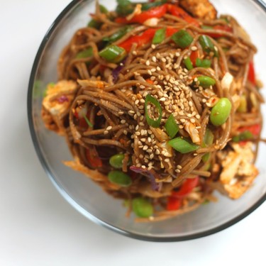 Klassische asiatische Aromen vereinen sich zu einem einfachen Gericht mit Tofu und würzigen Soba-Nudeln. Wer noch nie Buchweizen-Soba gegessen hat, wird um eine köstliche Erfahrung reicher werden. Soba ist eine wirklich grossartige Nudel für Salate, denn sie behält ihre Festigkeit und nimmt perfekt jedes Aroma auf. Die Jalapeños können weggelassen werden, dann wird das Gericht milder.