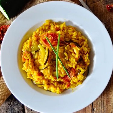 Dieses Safranrisotto mit Zucchini und sonnengetrockneten Tomaten hat einen unglaublichen Geschmack. Ob als Beilage oder Hauptgericht, es ist das perfekte Reisgericht für jeden Anlass und dazu noch vegan und glutenfrei!