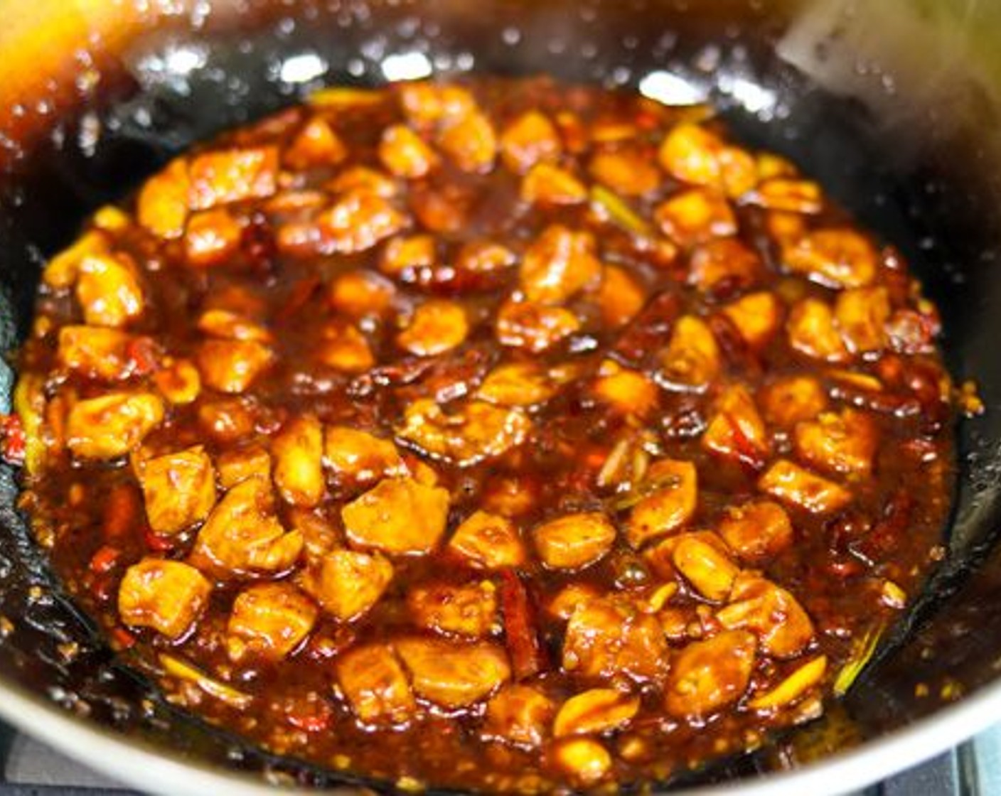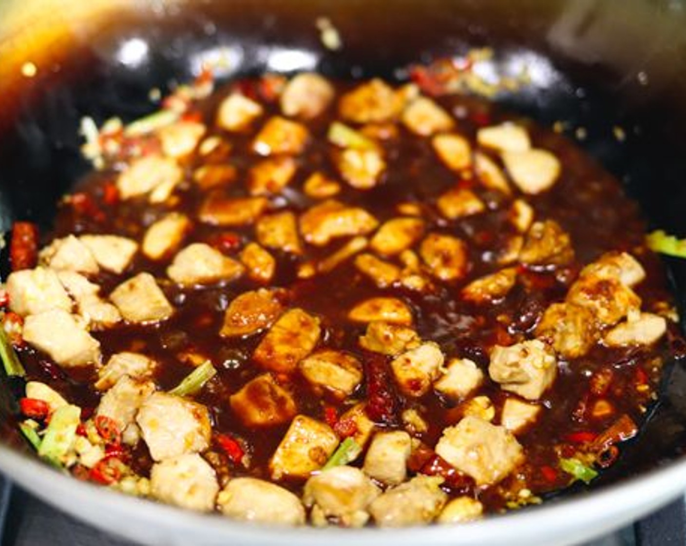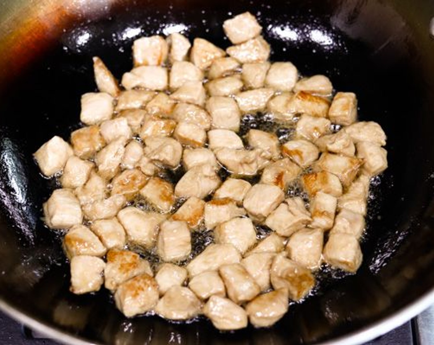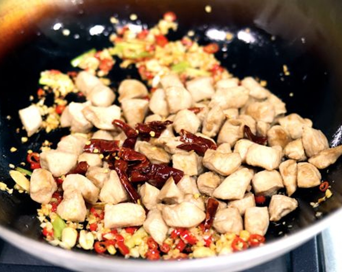 Den Herd wieder einschalten und einen weiteren Schuss Sesamöl (1/2 TL) zu dem bereits im Wok befindlichen Erdnussöl hinzufügen. Den Wok wieder anheben und in kreisenden Bewegungen drehen, damit sich das Öl verteilt. Dann zurück auf den Herd stellen, damit er sich erhitzt. Sobald er schön heiss ist, das Hähnchenfleisch hinzufügen und gleichmässig im Wok verteilen. Das Fleisch etwa 1 Minute braten und bräunen lassen, bevor die Stücke gewendet werden.