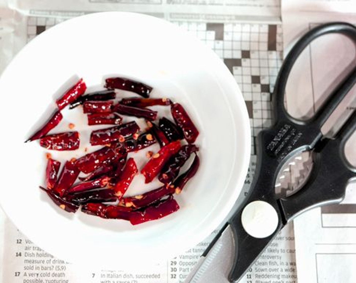Chilis (6) hinzufügen und vorsichtig im Wok umrühren, etwa 20 Sekunden bis sie knusprig werden. Darauf achten, dass sie nicht verbrennen! In ein Sieb geben und das Sieb über den Wok halten, damit das Öl zurücktropfen kann. Die Chilis in eine kleine Schüssel leeren. Sobald sie nicht mehr zu heiss sind, Chilischote mit einer Küchenschere in 2 oder 3 Stücke schneiden.
