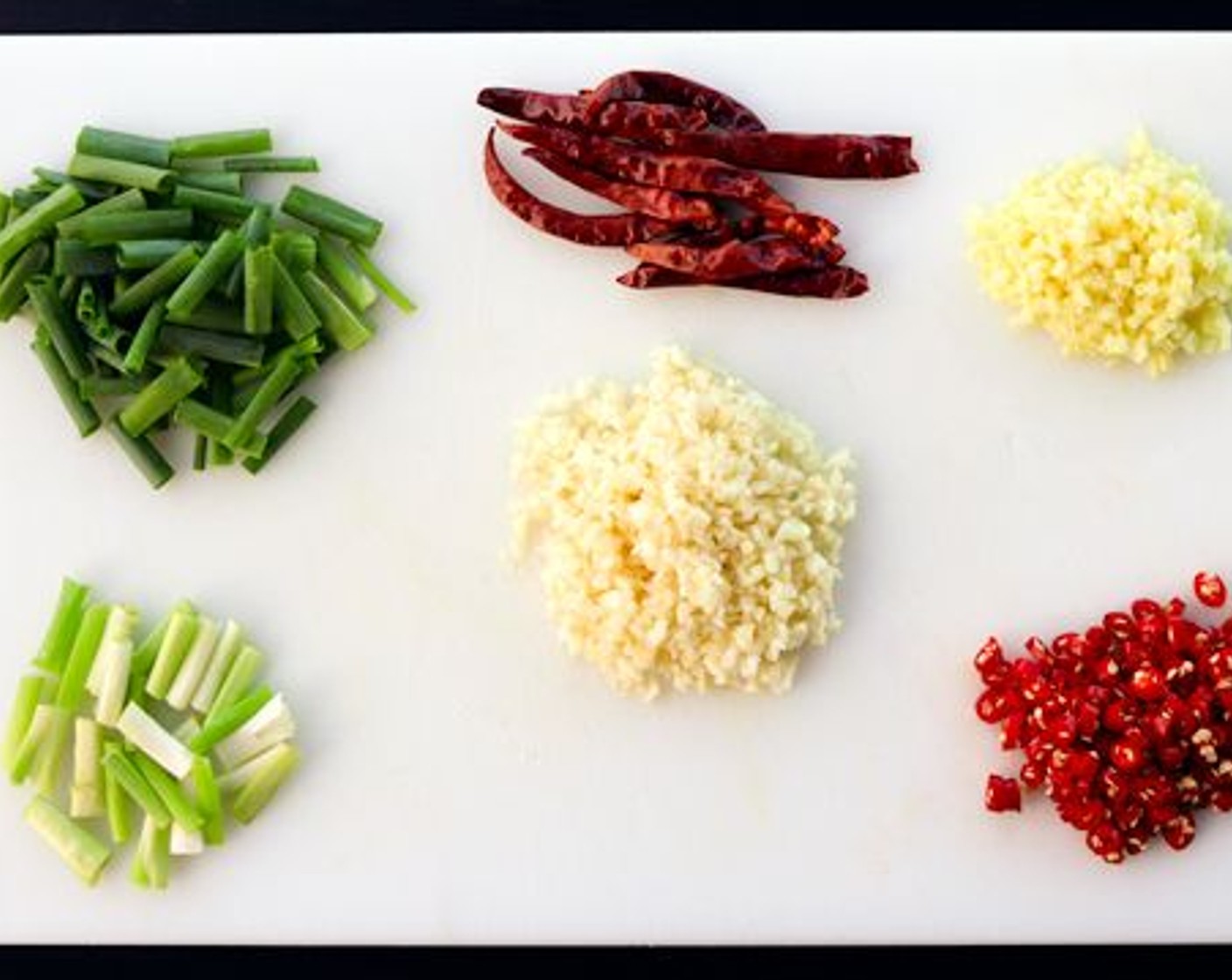 Gehackten Knoblauch (7 Zehen), gehackten Ingwer (2 Esslöffel) und gehackte Zwiebeln (3) in eine kleine Schüssel geben. Gehackte Chilis (5) und Frühlingszwiebelgrün in zwei separate Schälchen füllen.