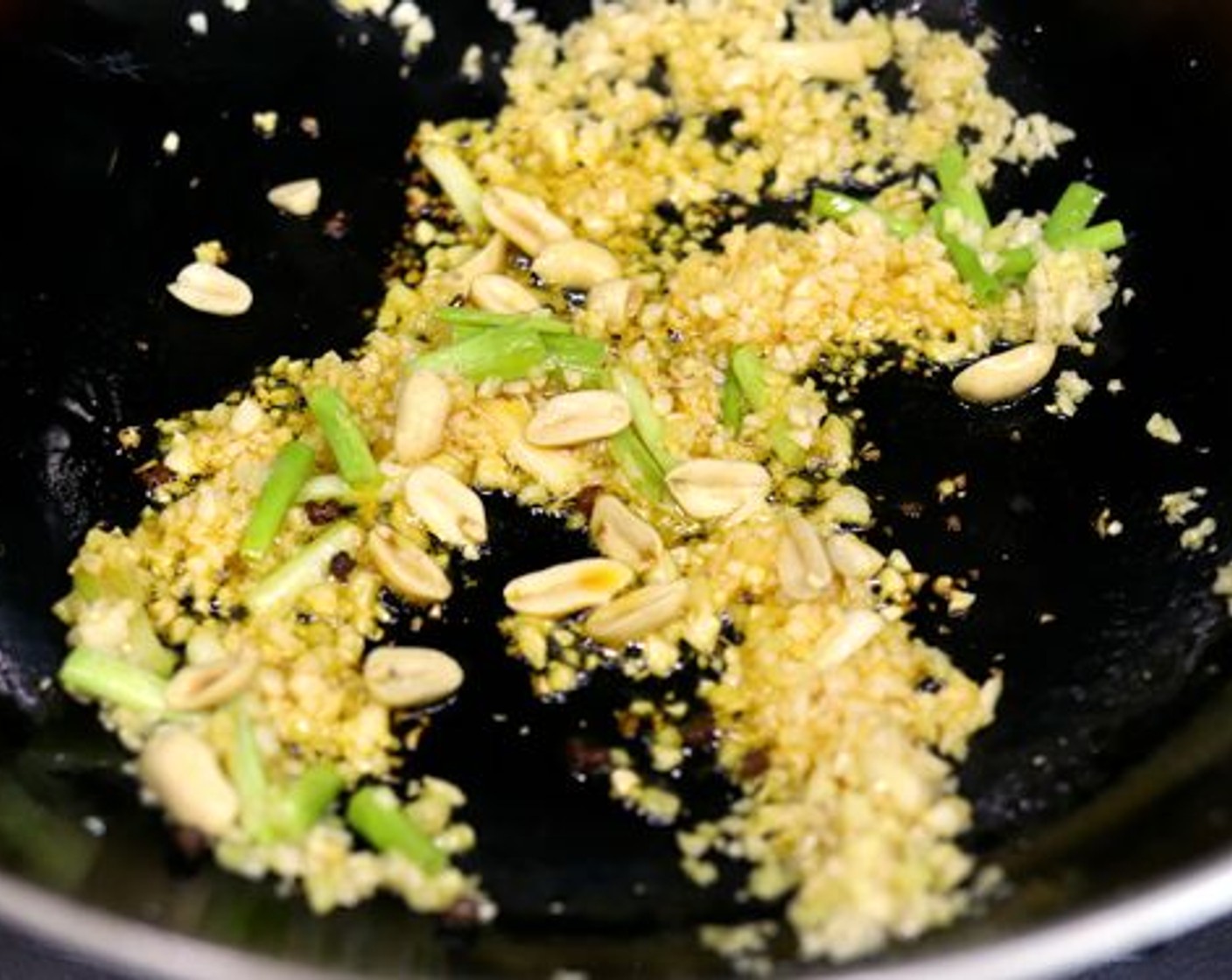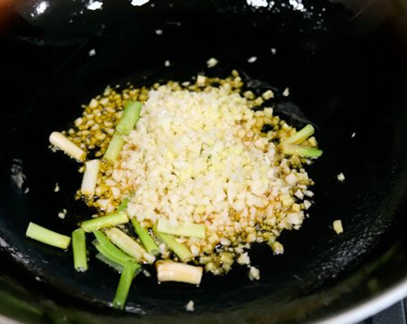 Sobald das Öl heiss ist, aber nicht raucht, Knoblauch, Ingwer und das Weisse der Frühlingszwiebeln hinzugeben. Kurz umrühren, damit der Knoblauch nicht anbrennt.