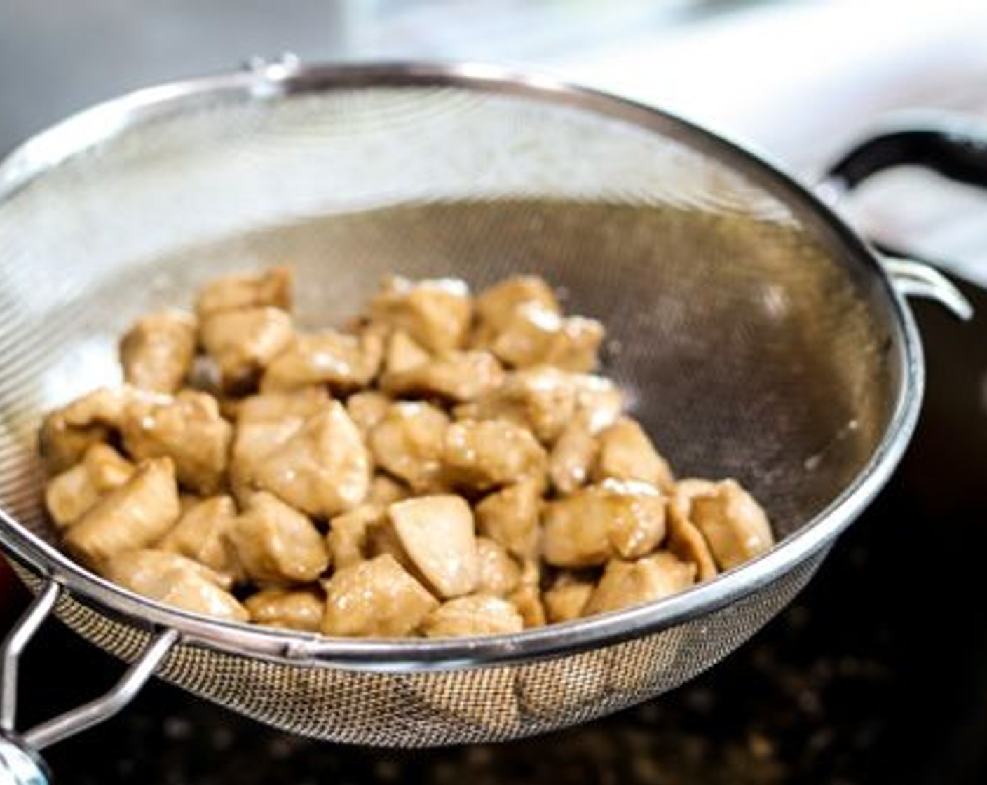 Sobald das Fleisch etwa zu 3/4 gar ist, in ein feinmaschiges Sieb geben und über den Wok halten, damit das Öl abtropfen kann. Das Fleisch in eine andere grosse, saubere Schüssel geben und beiseitestellen. Das Öl im Wok wegschütten und mit Papiertüchern auswischen. Wieder auf den Herd stellen.