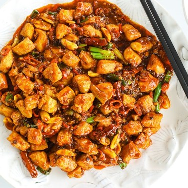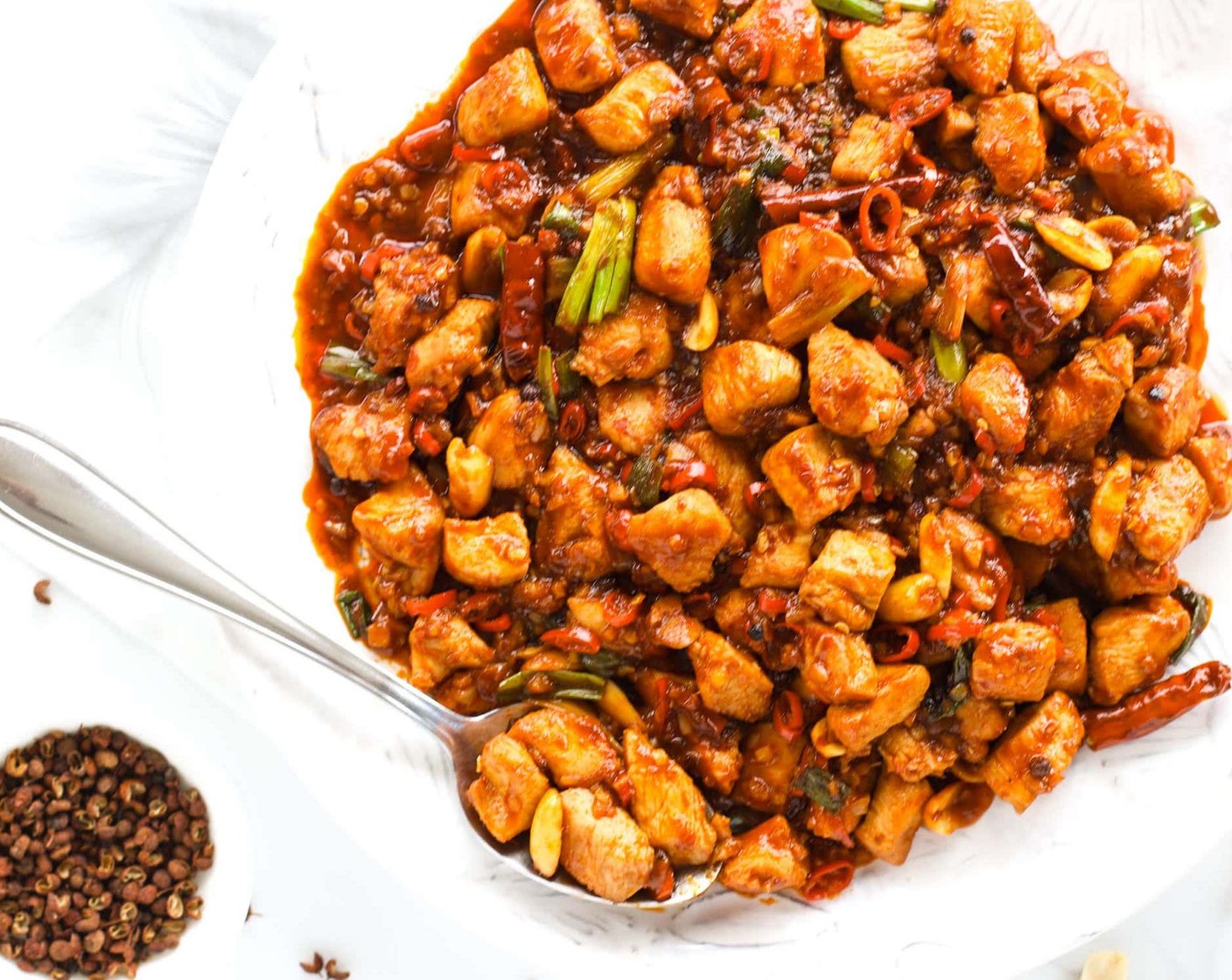 Erdnüsse (1 EL) und Szechuan-Pfefferkörner (1/2 TL) hinzugeben. Die Erdnüsse etwa 20 Sekunden im Wok bräunen lassen, bevor sie geschwenkt werden.