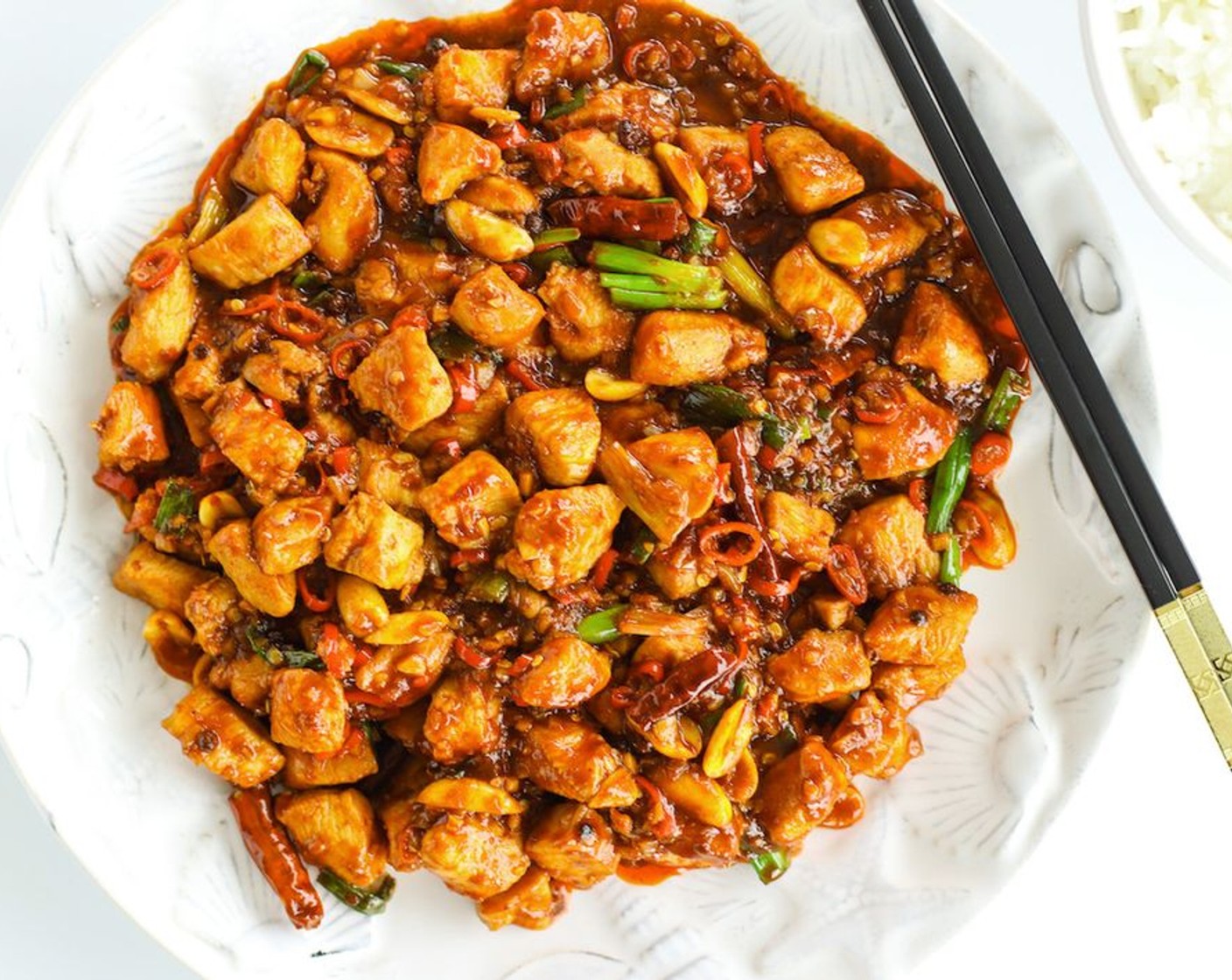 Die Frühlingszwiebeln hinzugeben und weitere 30 Sekunden schwenken. Den Herd ausschalten und das Gericht auf einem Teller anrichten. Mit gedämpftem, weissem Reis servieren. Geniessen!