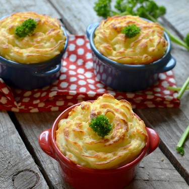Bei 200 °C im Ofen etwa 10 bis 15 Minuten backen. Dann noch 4 bis 5 Minuten unter den Grill schieben, bis das Kartoffelpüree eine schöne goldbraune Kruste bildet.