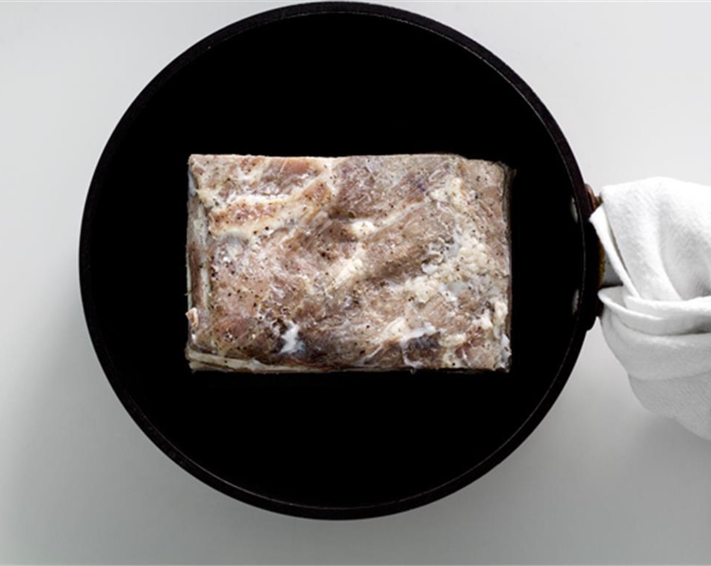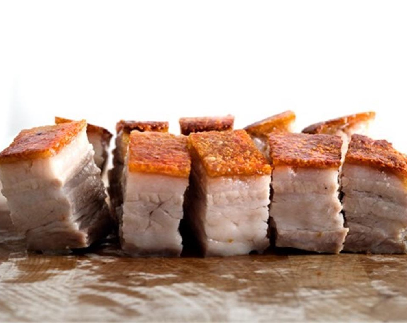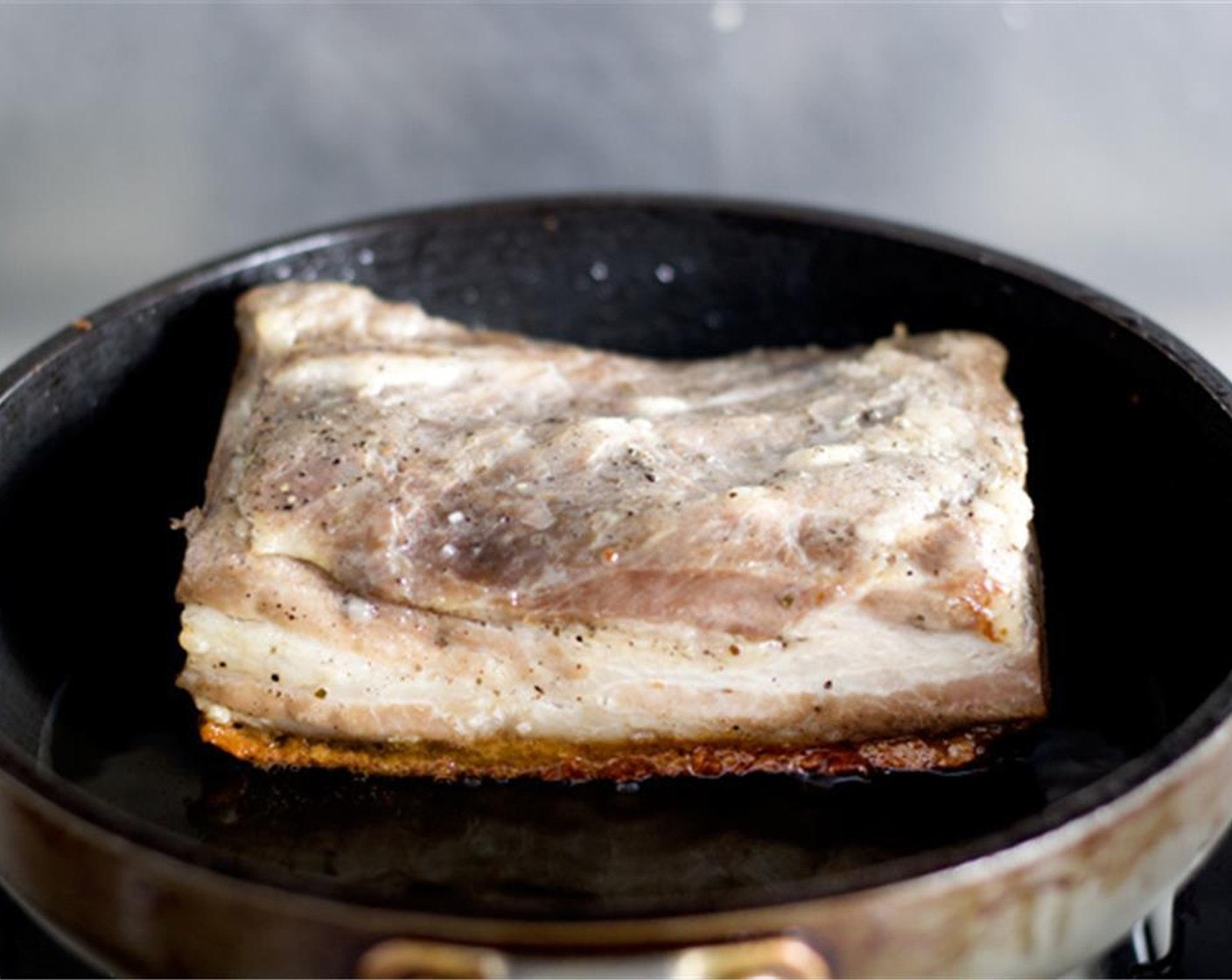 30 Minuten vor dem Servieren den Schweinebauch vorsichtig vom Backblech nehmen.