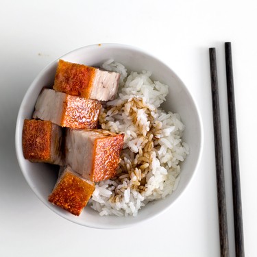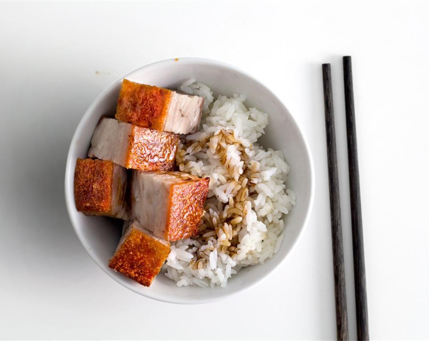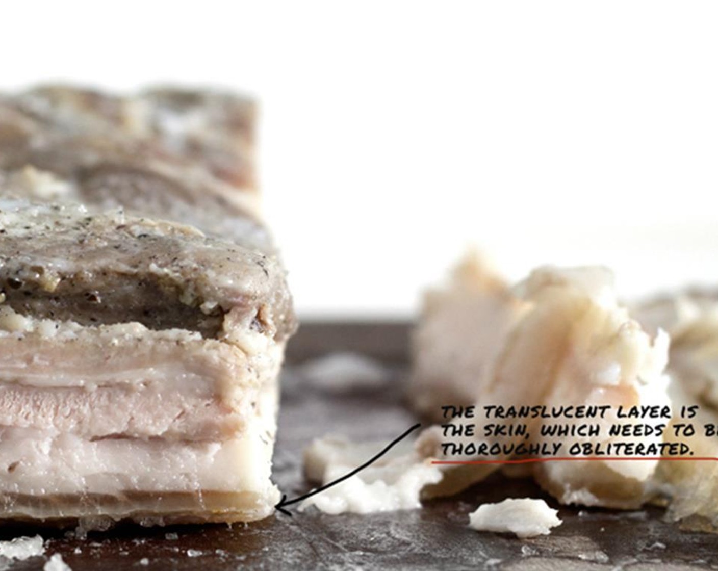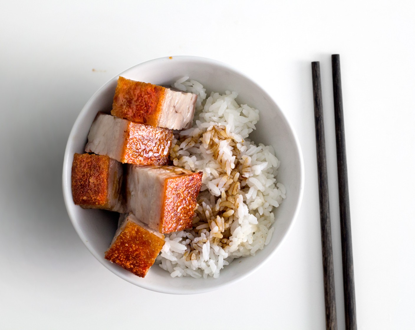 30 Minuten vor dem Servieren den Schweinebauch vorsichtig vom Backblech nehmen.