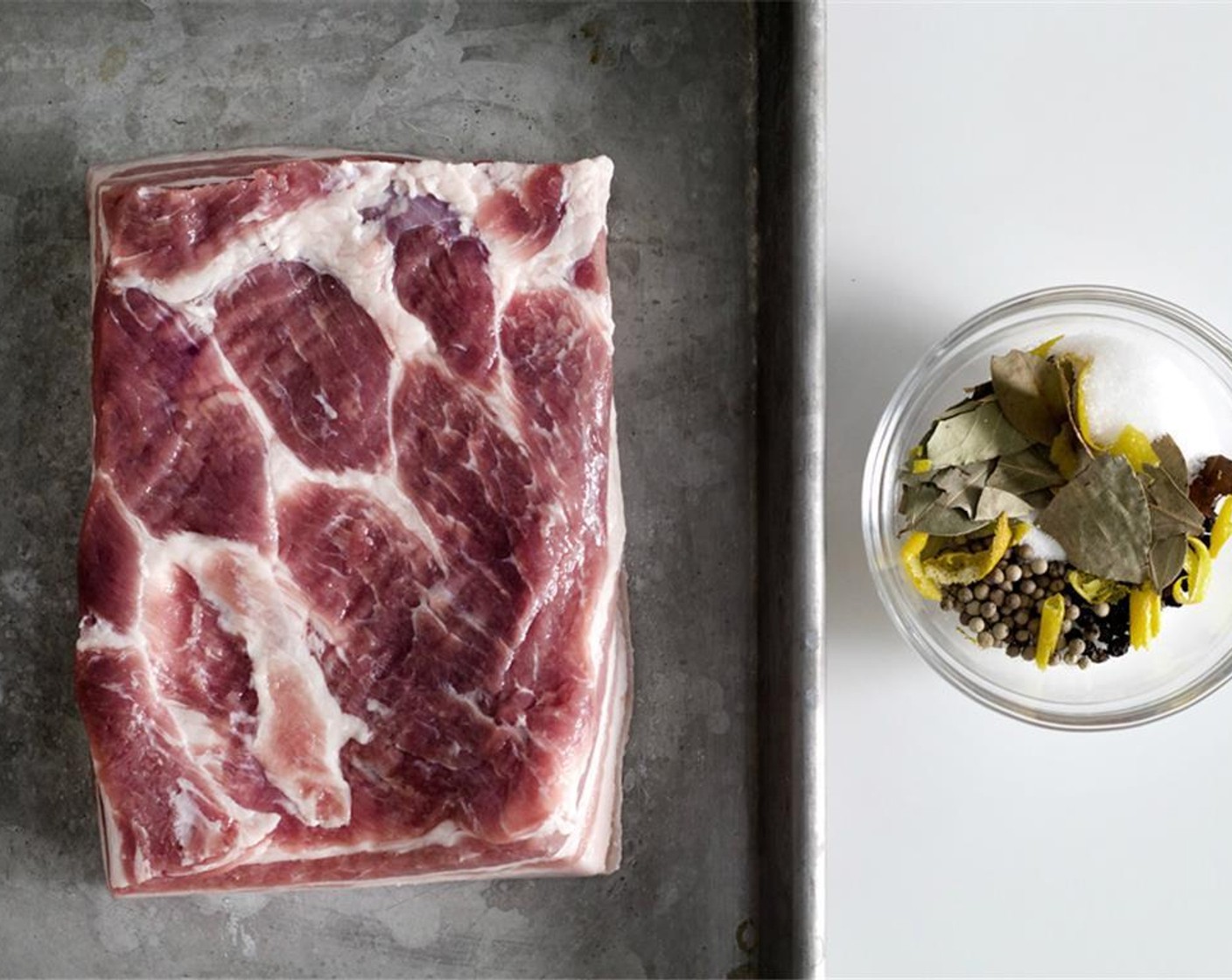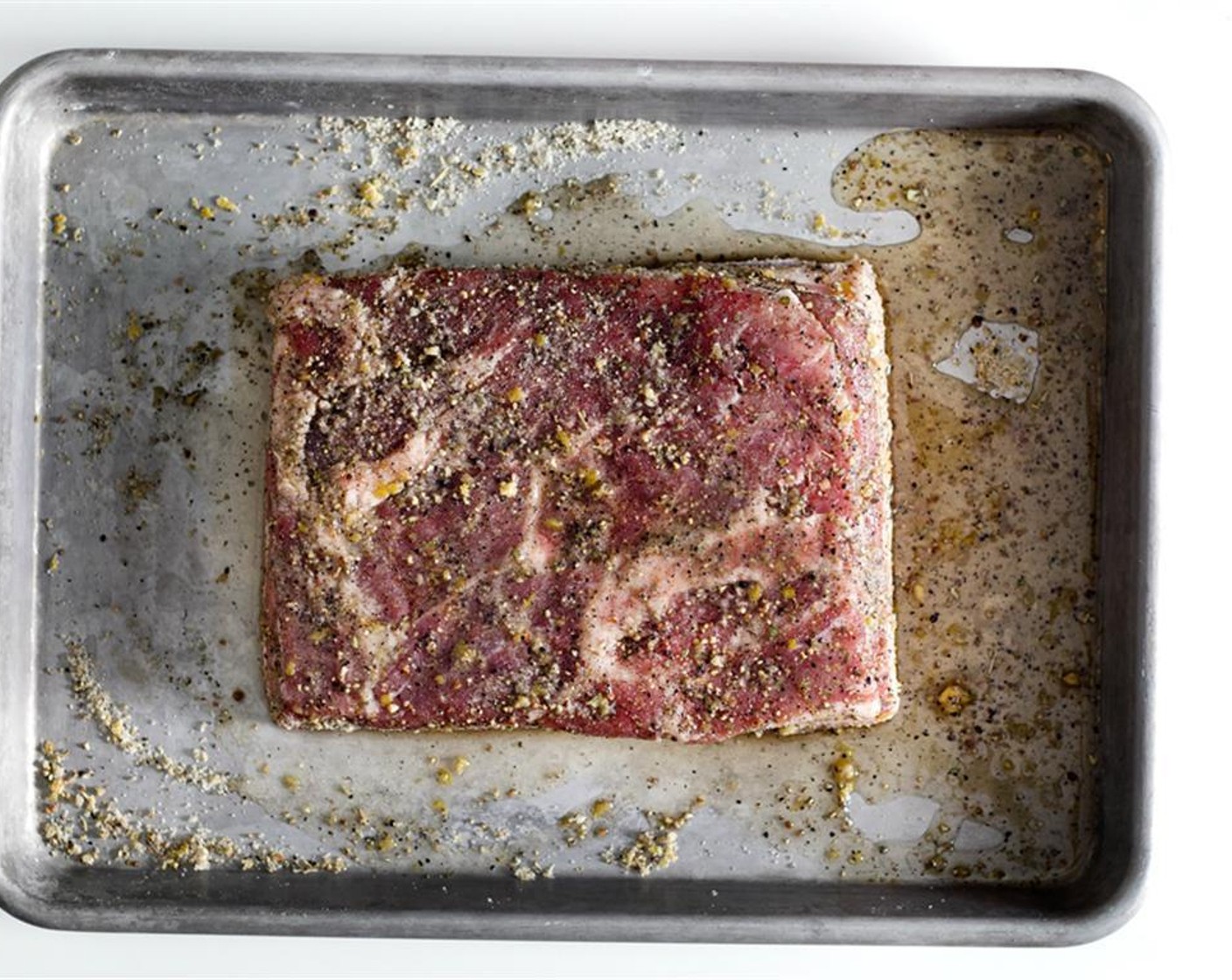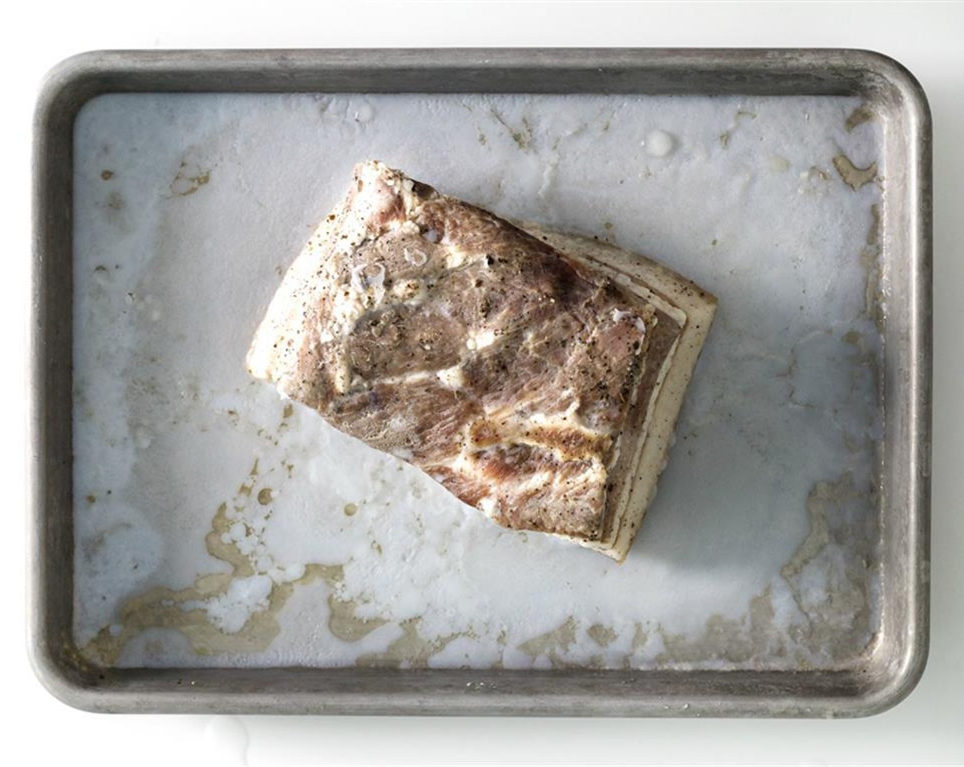 Schweinebauch, mit Schwarte (545 g) auf ein Backblech legen. Alle Seiten des Schweinebauchs gleichmässig mit der Salzmischung einreiben.